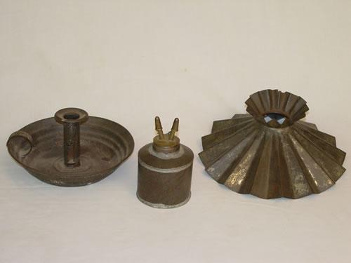 (3) PCS. OF PRIMITIVE 19TH CENT. TIN WARE: (1) 7" PUSH-UP CHAMBER CANDLESTICK, (1) OIL LAMP FONT W/ DOUBLE BRASS BURNER, & (1) 9" CRIMPED LAMPSHADE - DENTS, WEAR, & IMPERFECTIONS