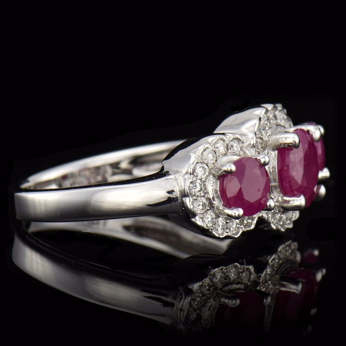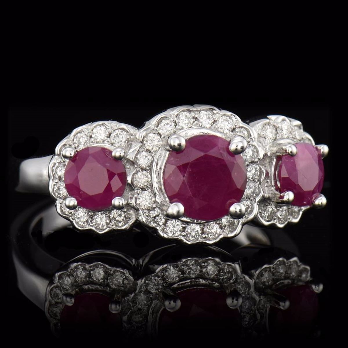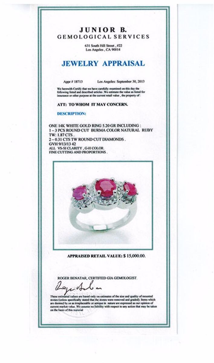 3 PCS ROUND CUT BURMA COLOR NATURAL RUBY TW 1.87CTS, 0.31CTS TW ROUND CUT DIAMONDS, 14K WG RING 5.20GR