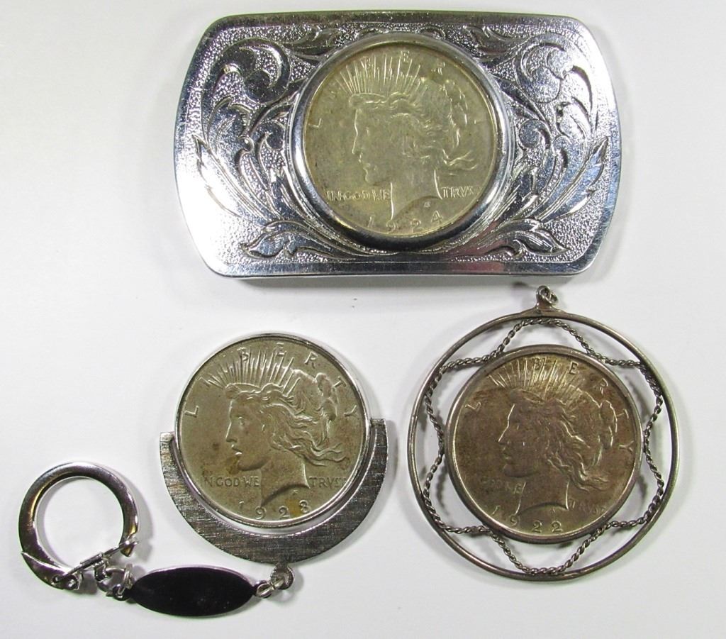3 - PEACE DOLLARS: 1922 IN BEZEL, 1924 BELT BUCKLE