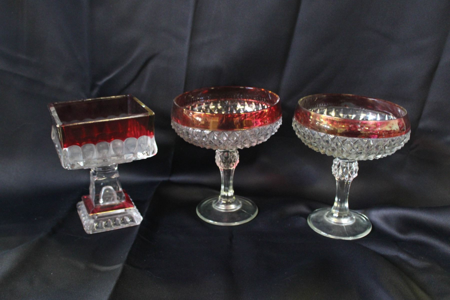 3 PEDESTAL CANDY DISHES RUBY FLASHED