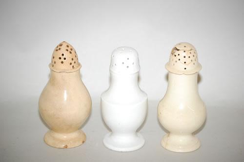 (3) PEPPER POTS - (2) CREAMWARE & (1) IRONSTONE UNDECORATED PEPPER POTS W/ DIFFERENT BODY STYLE & FOOTED BASES (4 3/4" AVG.) - LOSSES, REPAIRS, STAINS, IMPERFECTIONS