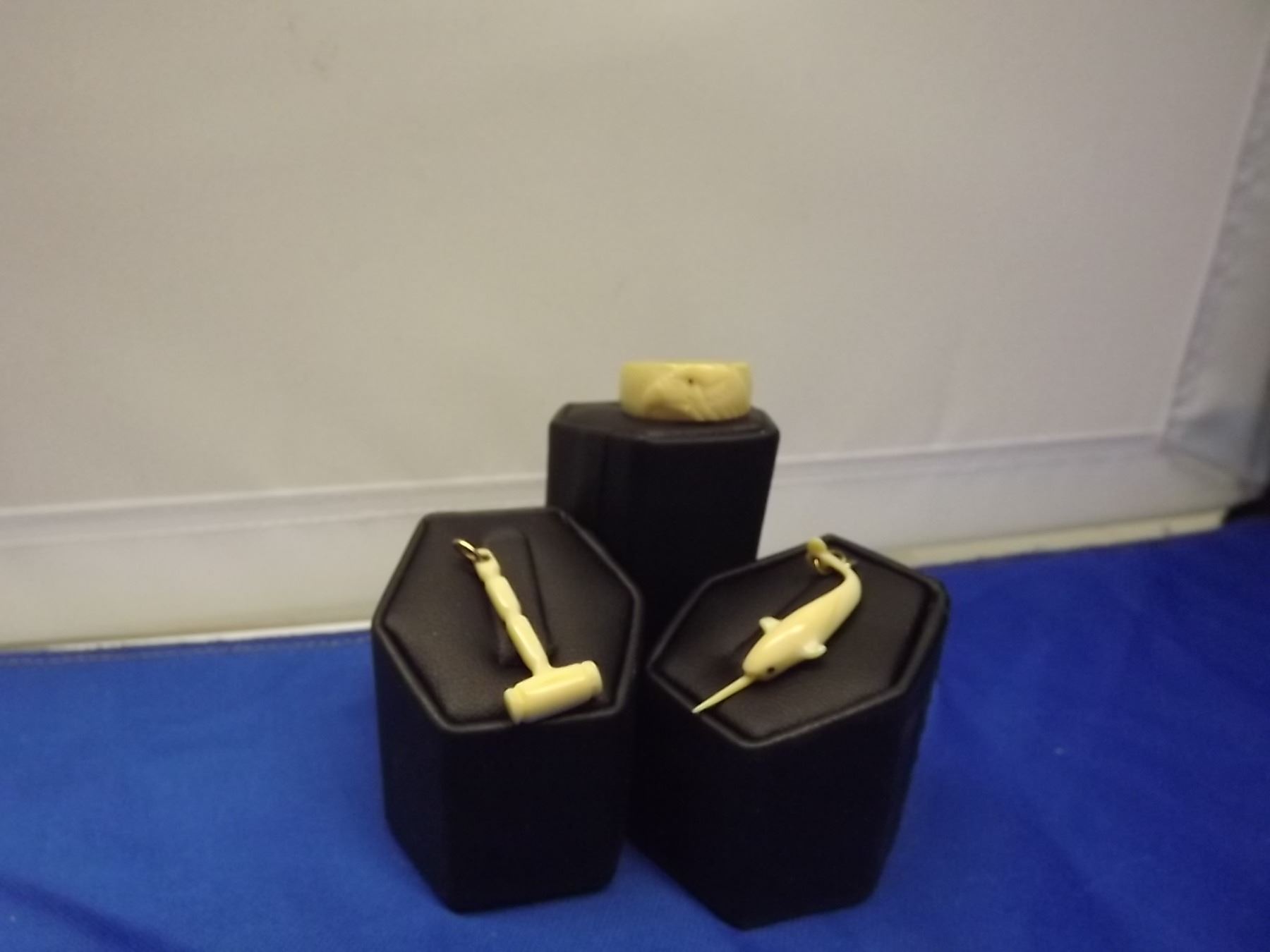 3 PIECE BONE CARVED SET: EAGLE RING, NARWAHL PENDANT, GAVEL PENDANT
