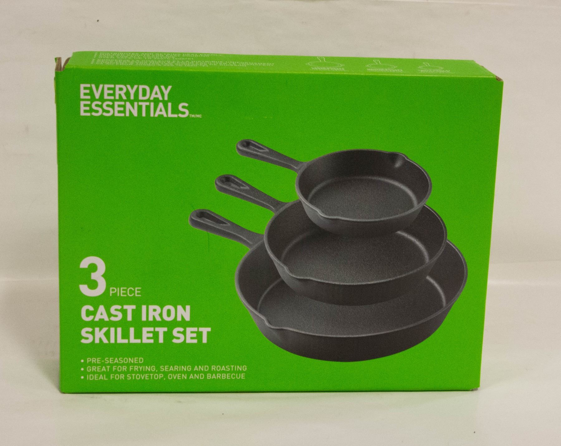 LARGE PAN: 14.4" X 10.6" MEDIUM PAN: 11.8" X 8.3" SMALL PAN: 9.5" X 6.3". MOLDED POURING SPOUTS FOR EASY POURING, SAFE FOR ALL COOKTOPS AND BBQ, OVEN SAFE UP TO 500F DEGREES. PRE-SEASONED.