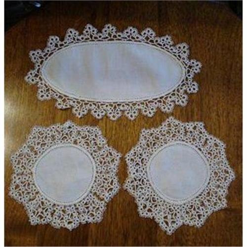 PRETTY 3 PIECE DRESSER OR VANITY SET, IT CONSISTS FROM 2 SMALL SNOWFLAKE SHAPE DOILIES AND ONE OVAL PIECE, MADE FROM BEAUTIFUL WHITE LINEN CENTER's AND EDGED WITH EXQUISITE TATTED LACE - as per images - Very fine, excellent condition, doilies, each measures about 6" in diam., and oval piece about 9 1/2" x 5 1/2" - US Buyer to pay 4.00 for shipping plus insurance.THANKS.
