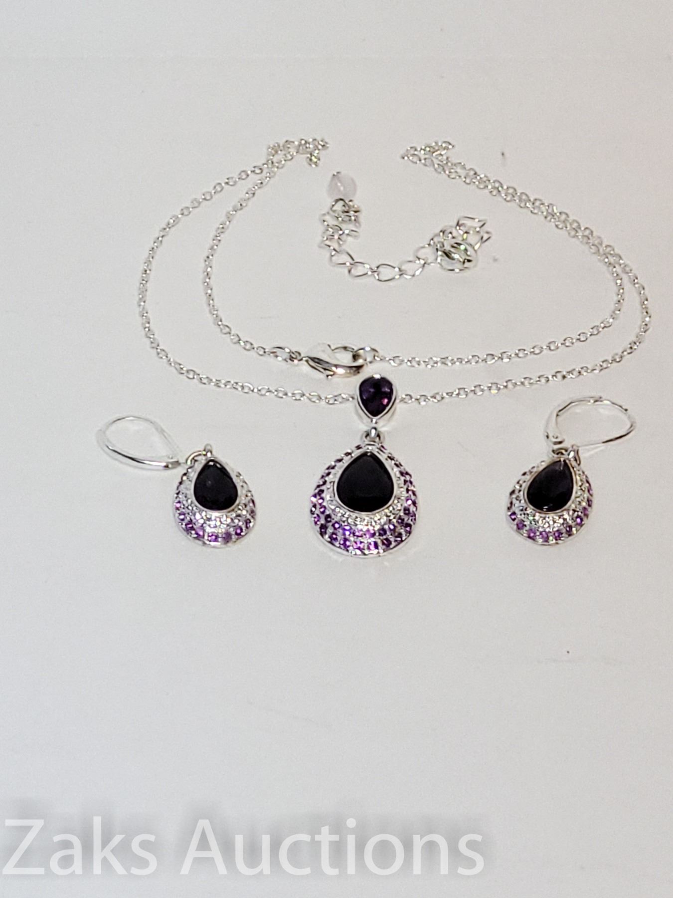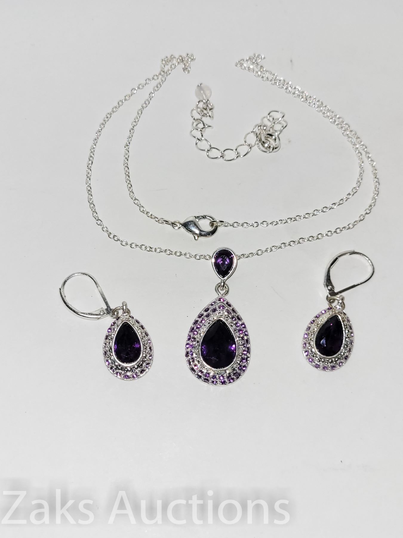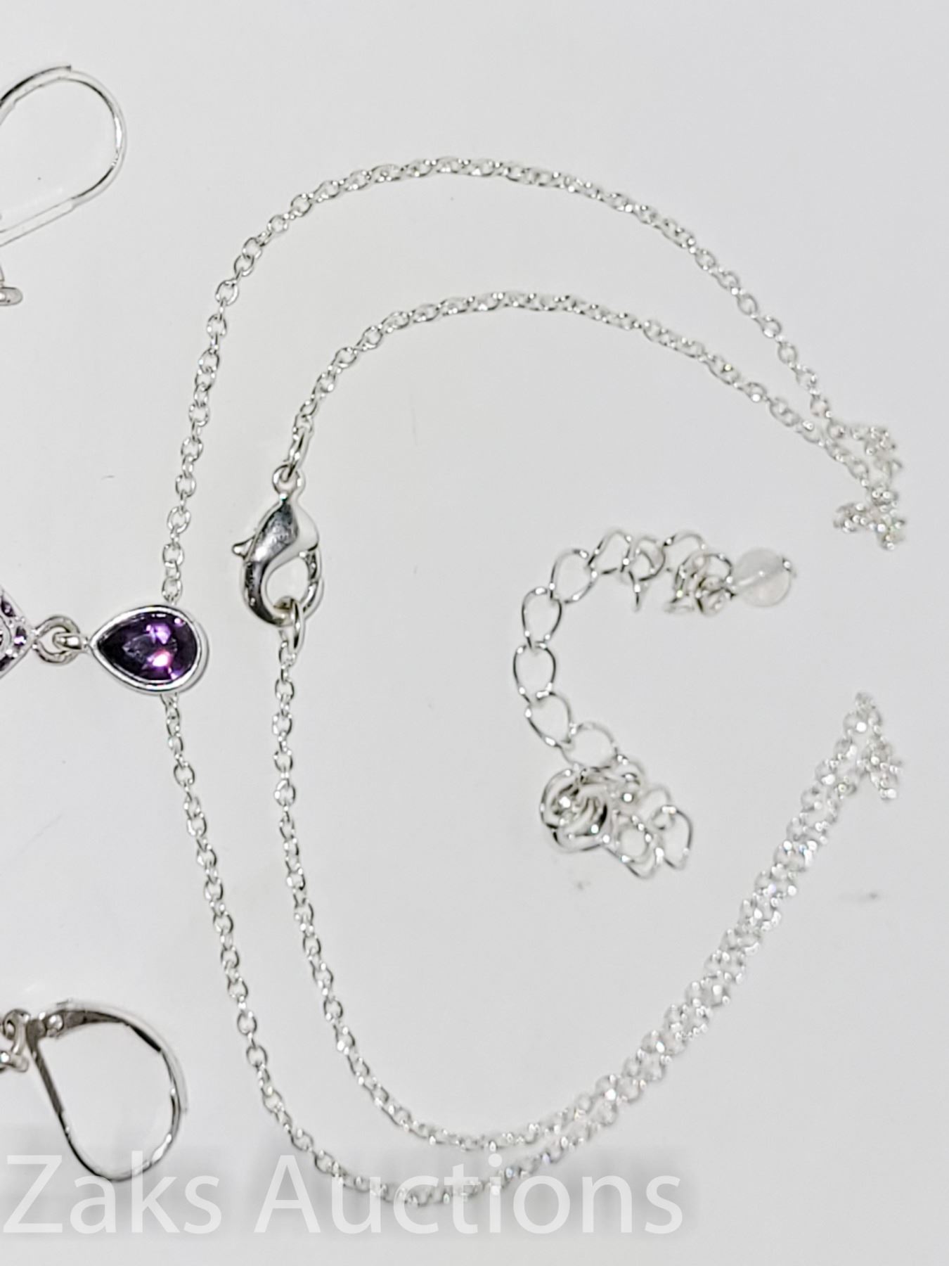 NICE, LIKE NEW, POSSIBLY AVON, 3 PC NECKLACE AND EARRING SET. DEEP PURPLE TEARPDROPS WITH CLEAR RHINESTONE ACCENTS.