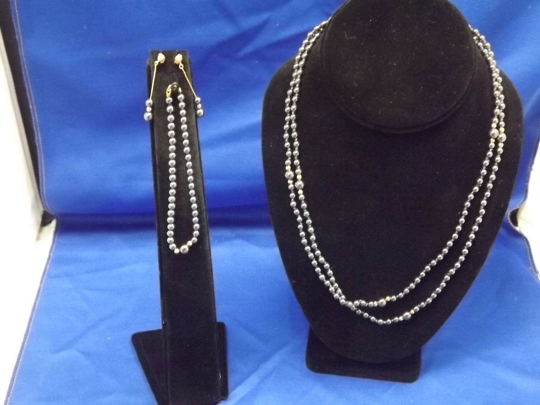 3 PIECE SET - BLACK PEARL HIGH POLISH WITH GOLD BEADS - NECKLACE, EARRINGS AND BRACELET