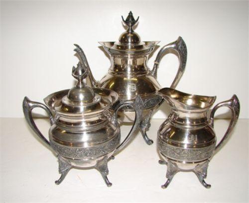 3 PIECE SILVERPLATE COFFEE SERVICE. Consists of coffee pot with hinged lid, covered sugar, & creamer. All are monogrammed D. Marked on bottom “John Carrow, Phila.” Coffee pot: 10.5” H. Sugar: 8” H. Creamer: 6” H.