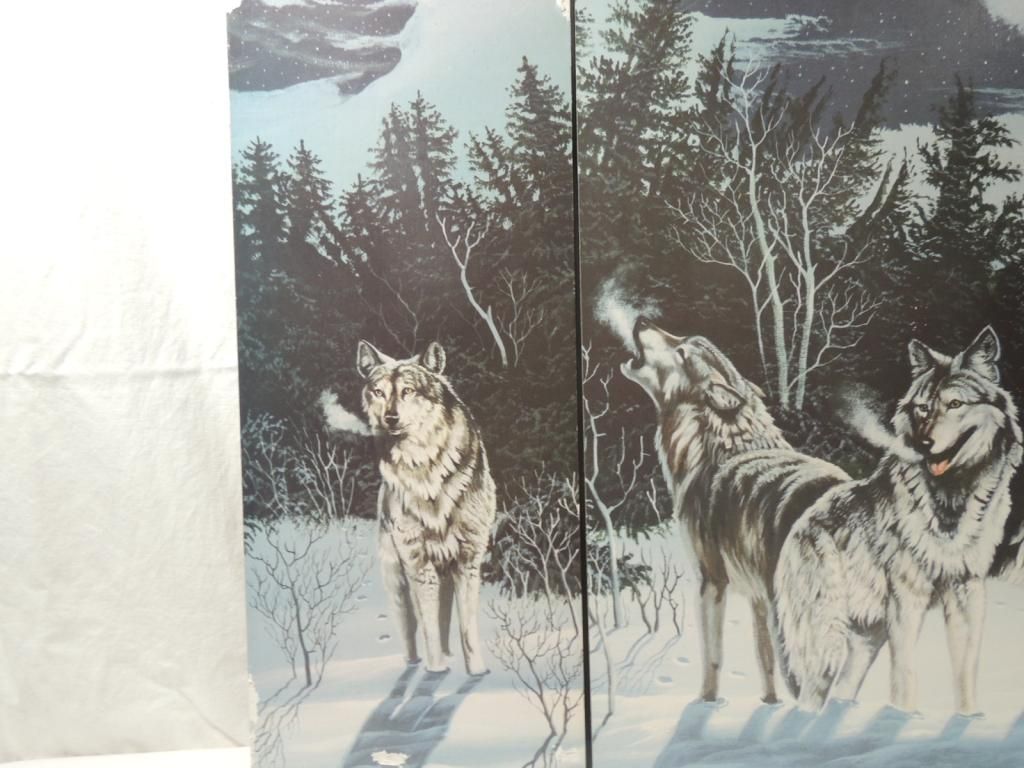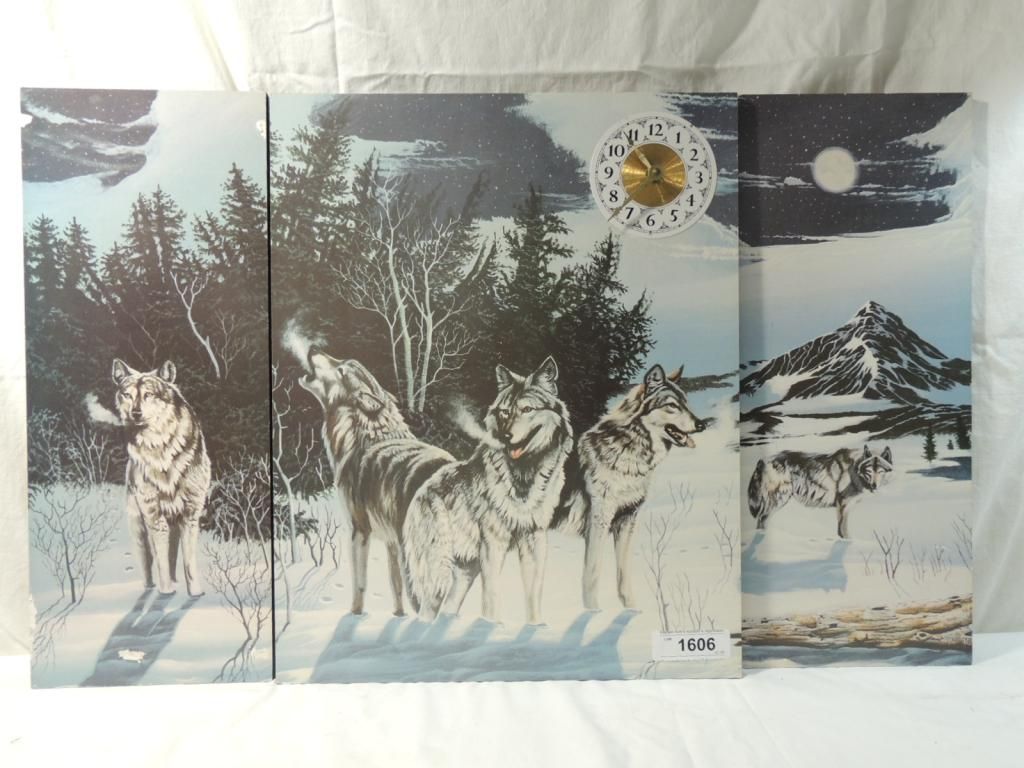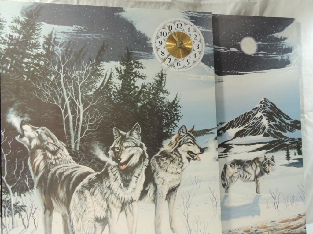 WALL CLOCK WINTER SCENE MOON MOUNTAINS WOLVES. AS SHOWN SEE PHOTO FOR MORE DETAILS.