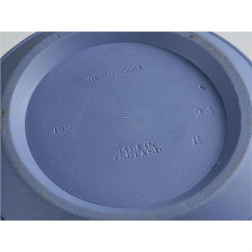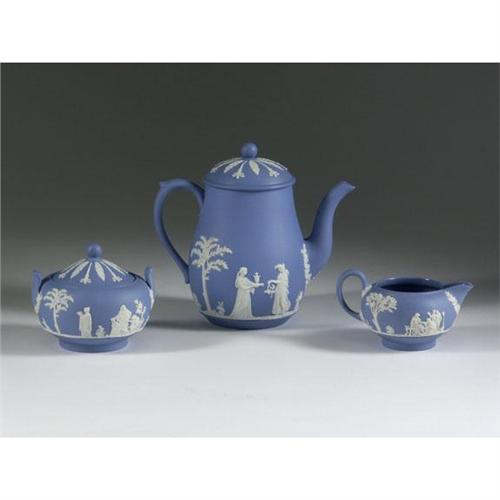 JASPERWARE: Three pieces of blue Wedgwood jasperware with allegorical scenes to include a coffee pot, 7.5'' x 7.75'', date marked on underside (1950), a creamer, 2.5'' x 5'', date marked on underside (1967), and a sugar bowl with lid, 4.75'' x 4.5'', date marked on underside (1966). All are hallmarked on underside.