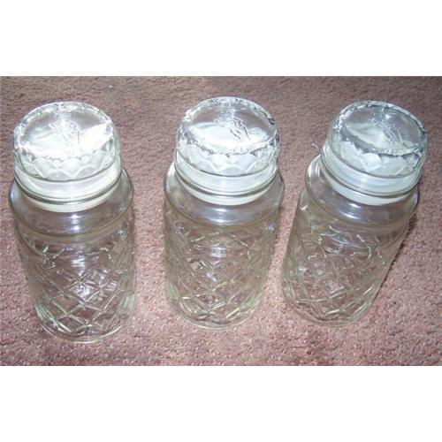 3 (THREE) COLLECTIBLE GLASS JARS - PLANTERS PEANUTS GLASS JARS WITH ETCHED DIAMOND SHAPED DESIGN ON GLASS. TOP HAS MR. PEANUT ENGRAVED ON GLASS LID. BOTTOM OF JARS HAS MR PEANUT ENGRAVED INTO GLASS WITH A #5, THE LETTER B IN A CIRCLE & 1984. UNSURE WHO THE GLASS MANUFACTURER IS. THERE ARE NO CHIPS OR CRACKS, JUST A LITTLE GLUE FROM WHERE THE ORIGINAL LABEL WAS. Photo showing engraving on glass tops & engraving on bottom of jars shown in photo's.