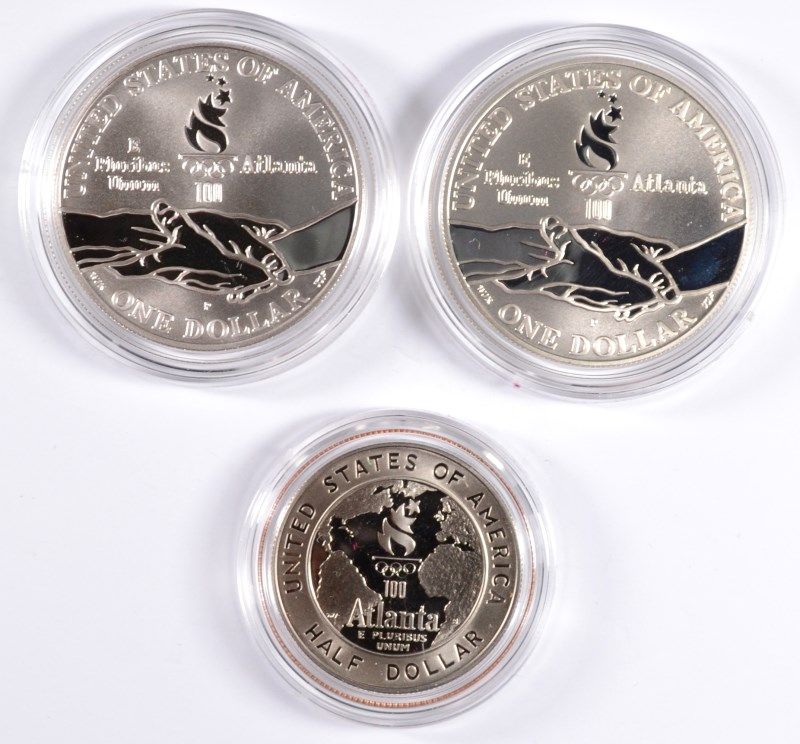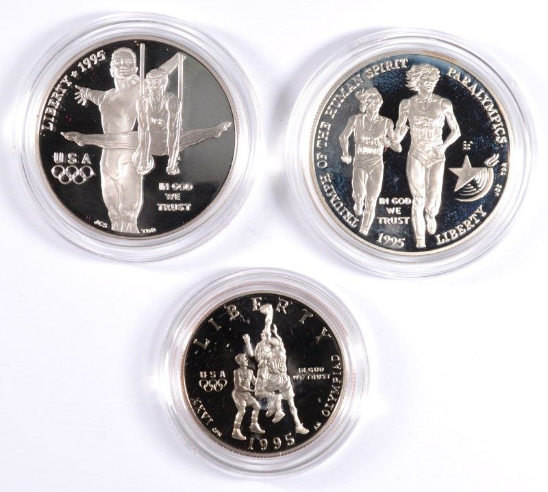 (3 ) PROOF 1995 OLYMPIC COINS: BASKET BALL HALF, BLIND RUNNER & GYMNAST DOLLARS