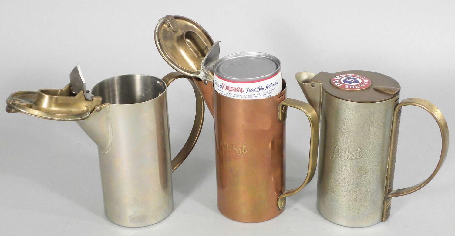 Lot of Three Pabst Blue Ribbon Can Opener Pitchers. Two have "Pabst" embossed on side and one has enameled Pabst emblem on top. All in very good condition.