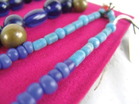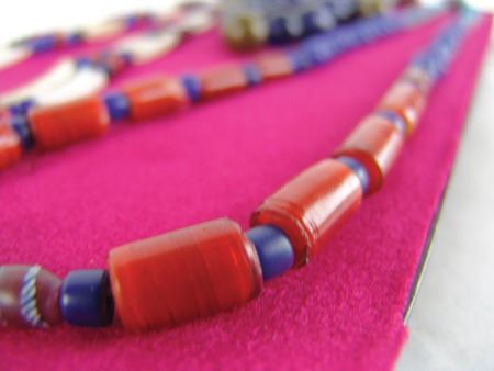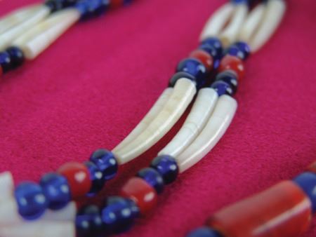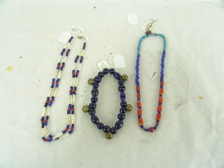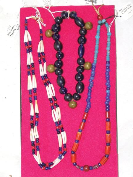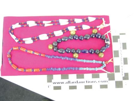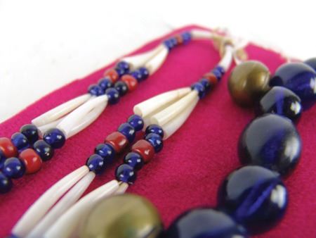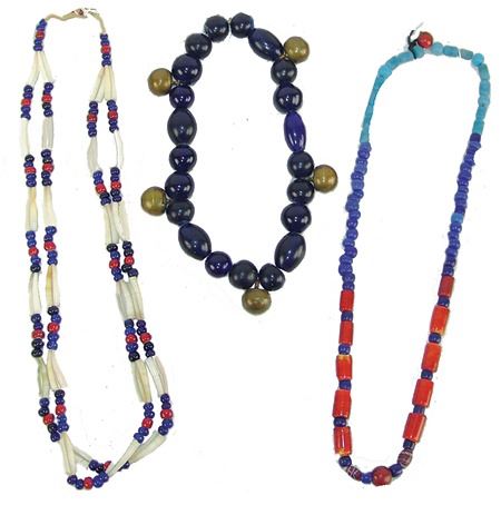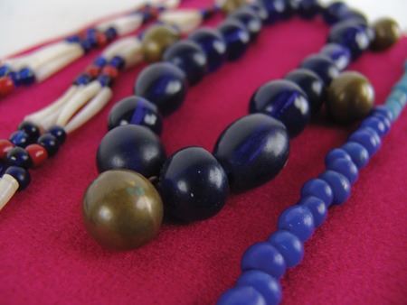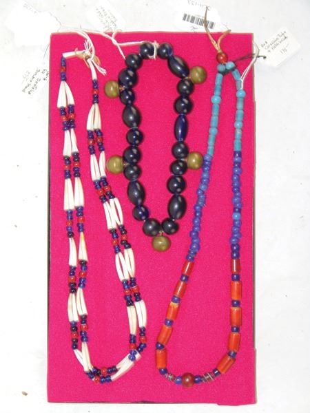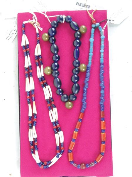Early 1900s, Includes a two-strand double dentalium necklace with cobalt and white heart beads, a short strand of larger Hudson Bay cobalt trade beads with brass button attachments, and a string of large yellow heart Cornaline d'Aleppo and Russian beads. All very good condition. Largest 26"