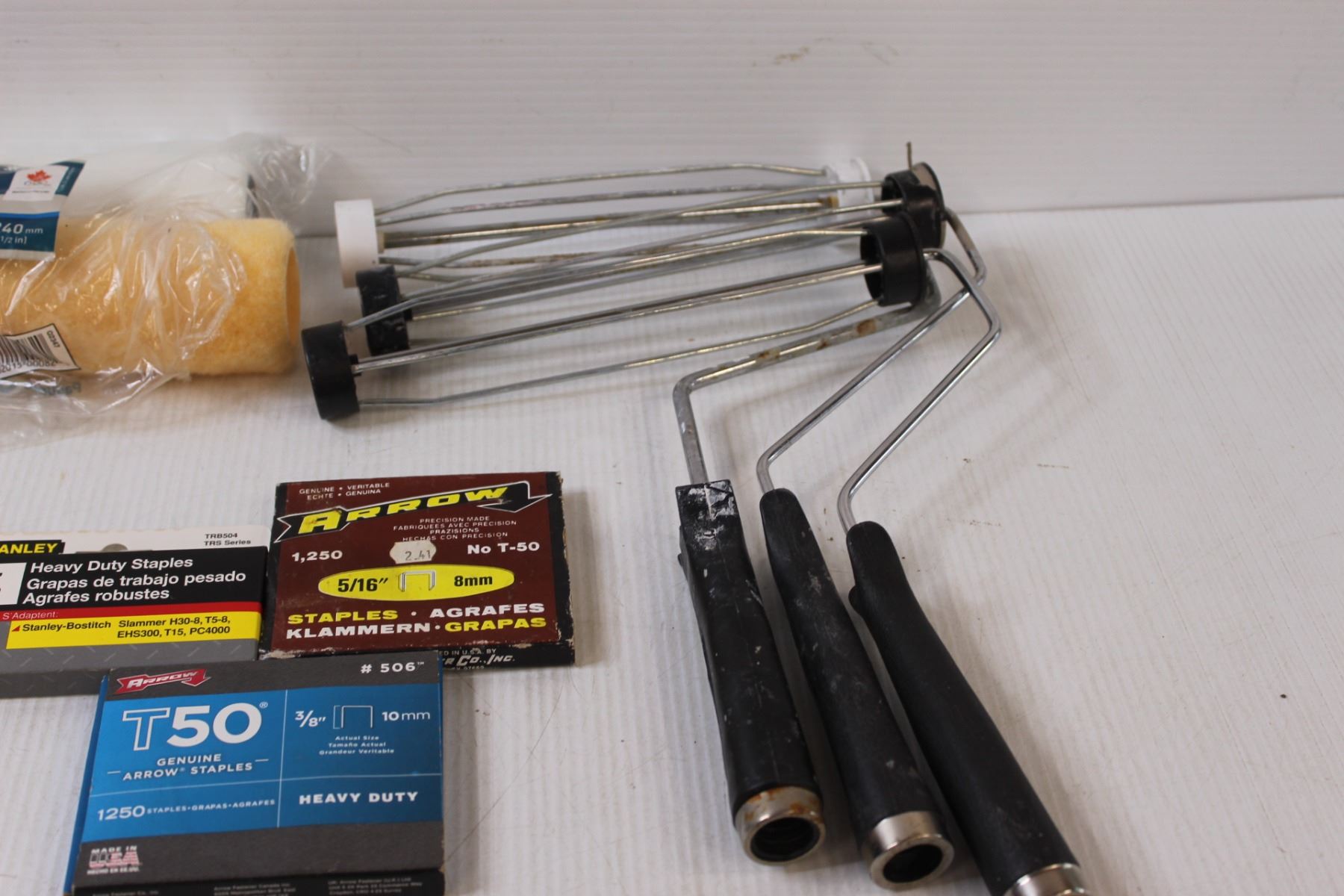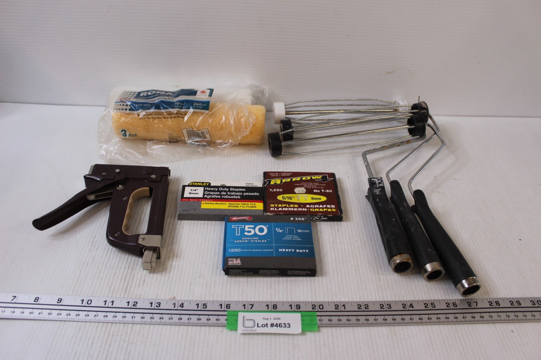 (3) Paint Rollers, (2) Paint Roller Refills, Staple Gun & Assorted Staples