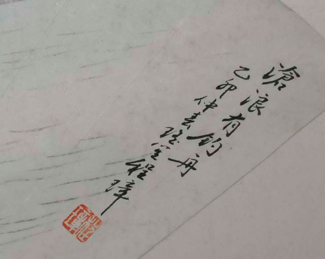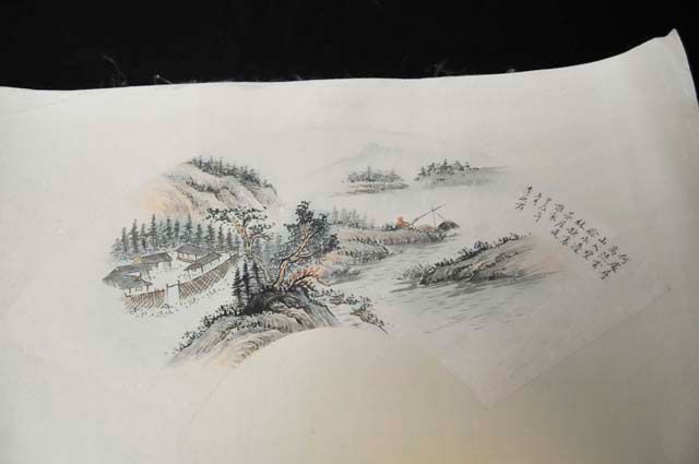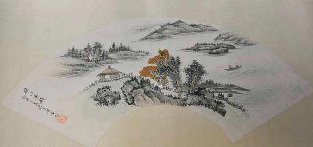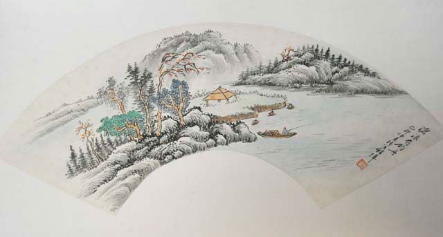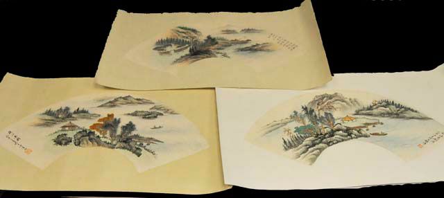 Paintings depicting boat on lake. Approx. 21" L X 7" W each. Please read our terms of sale.