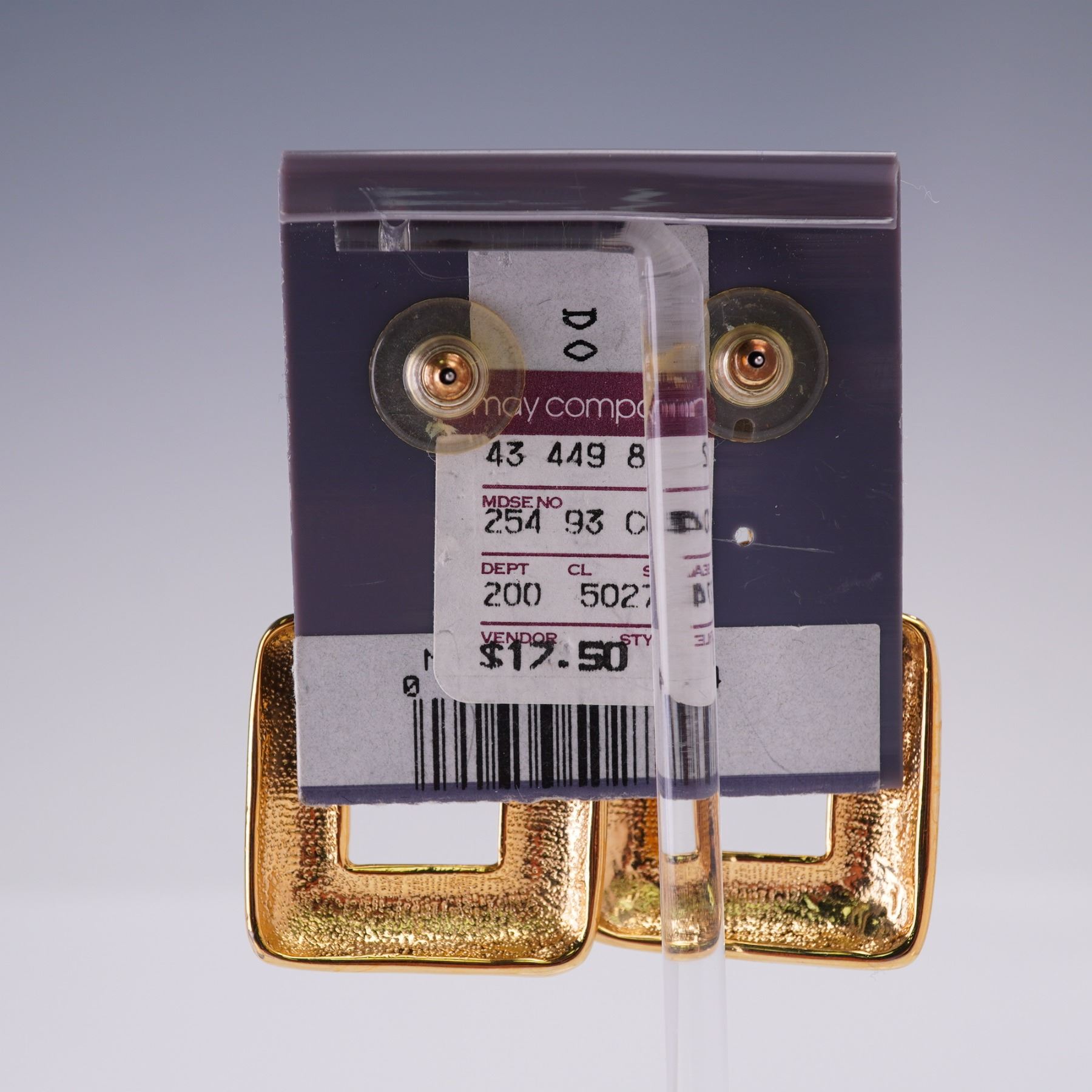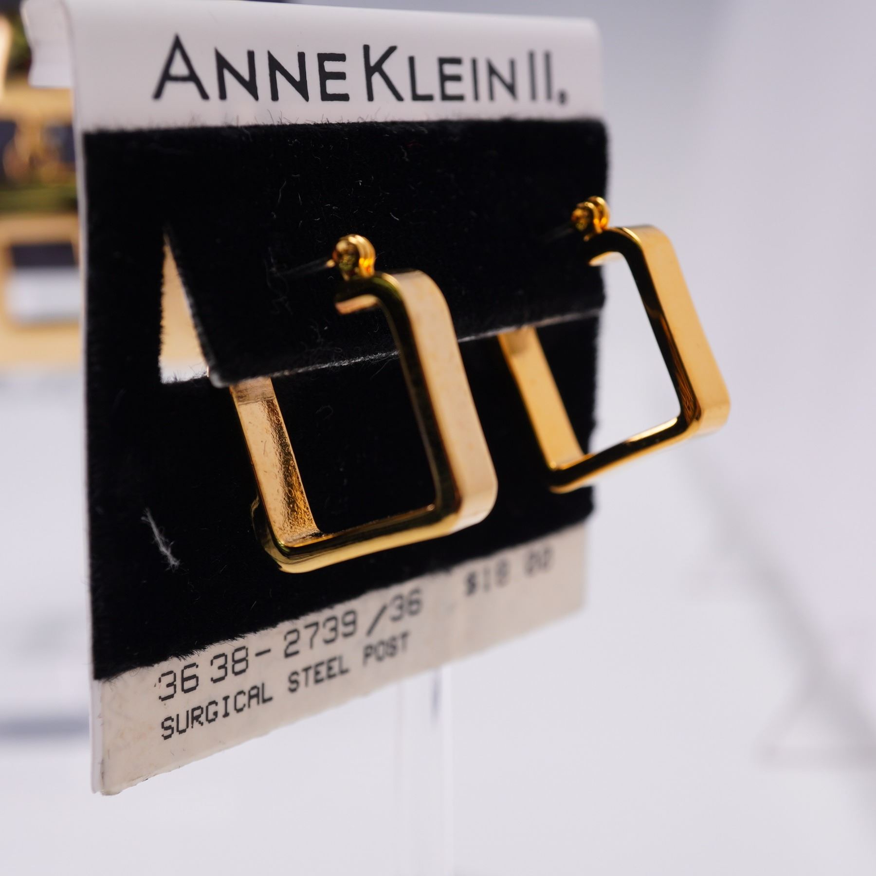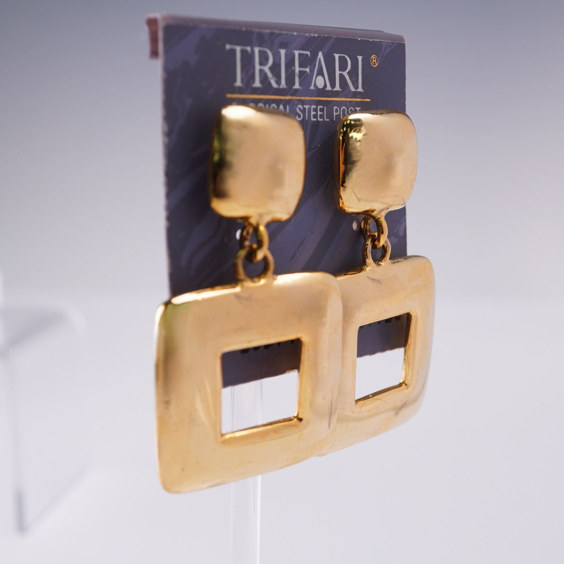 Lot of 3 pairs of vintage post back earrings in gold tone, including Trifari square dangle earrings, Monet textured chain design drops, and Anne Klein II angular open hoops. Each pair is mounted on original retail card. Sizes range from 1"H to 3.25"H.