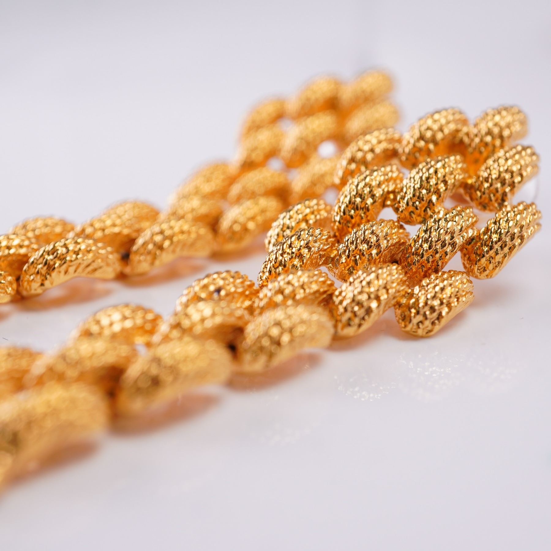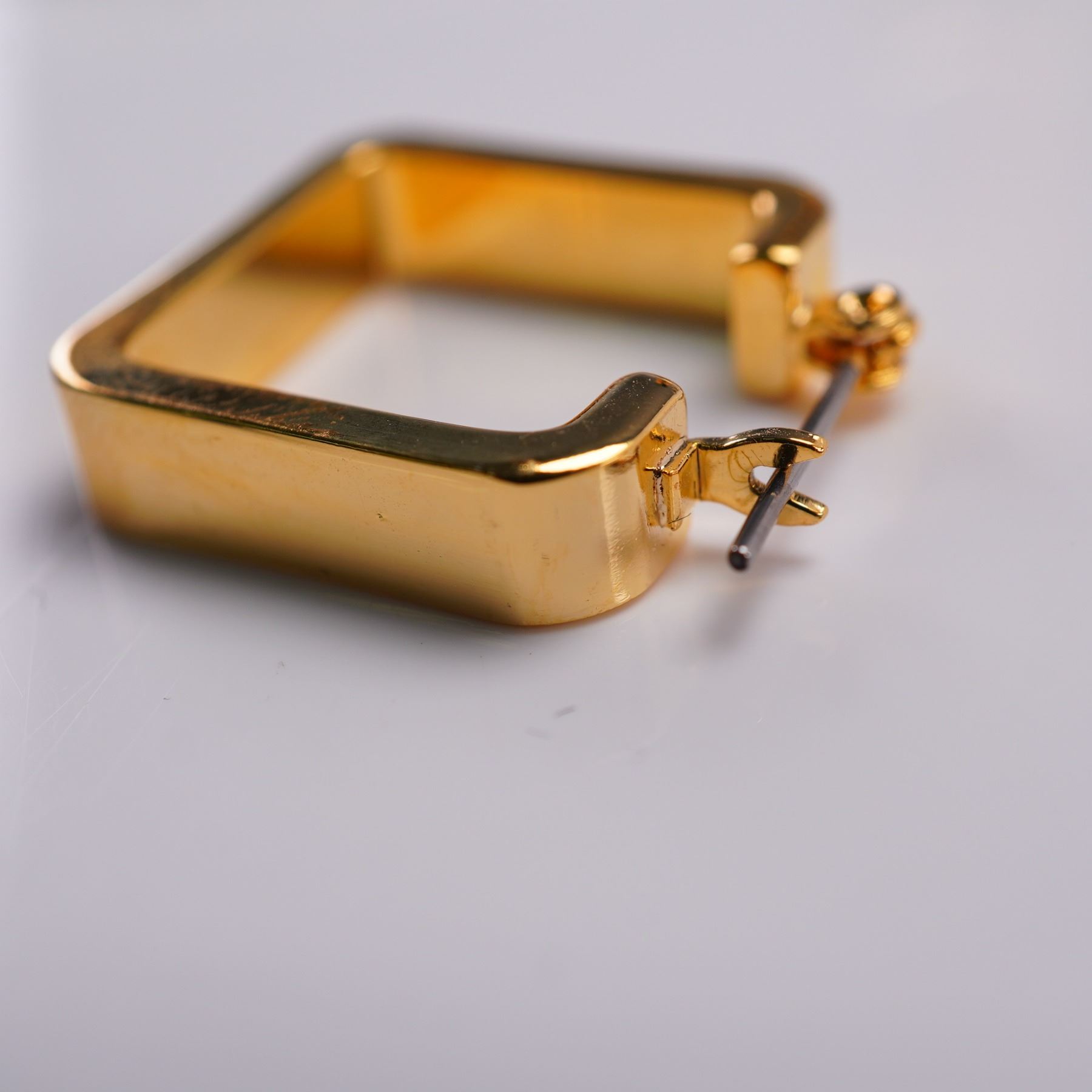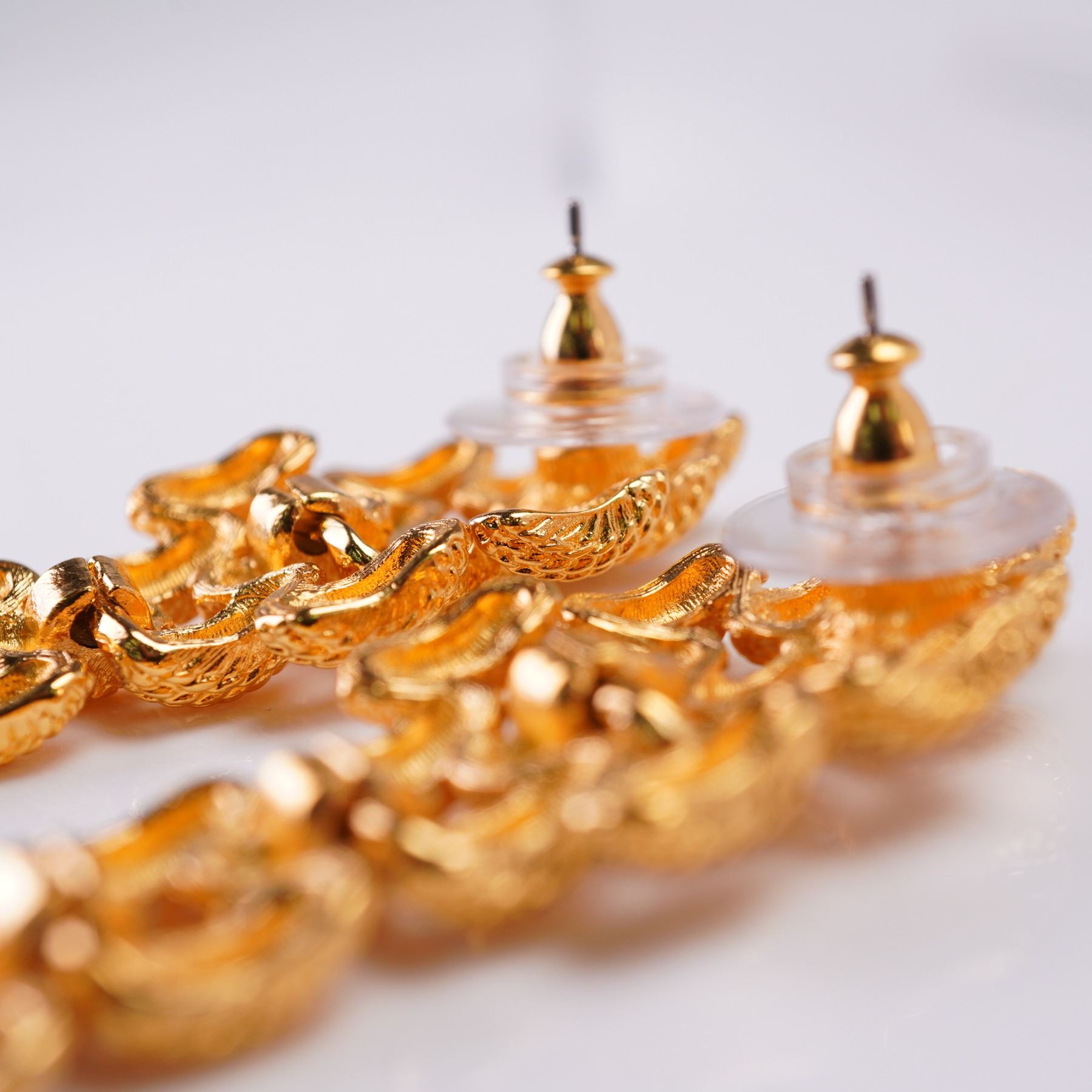 Lot of 3 pairs of vintage post back earrings in gold tone, including Trifari square dangle earrings, Monet textured chain design drops, and Anne Klein II angular open hoops. Each pair is mounted on original retail card. Sizes range from 1"H to 3.25"H.