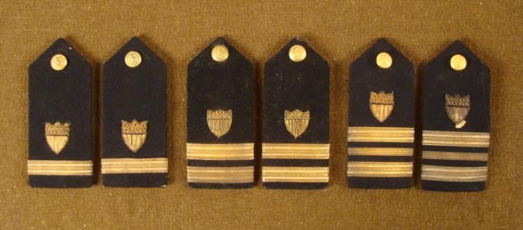 These three pairs of Navy Shoulder Boards have 1, 2 and 3 Stripes. One is from Vanguard, New York. They are wool with gold embroidery, and metal buttons, all in very good conditon, except for one which has some mothing.