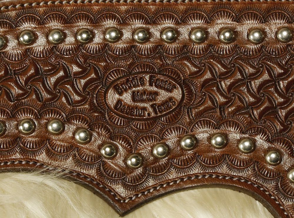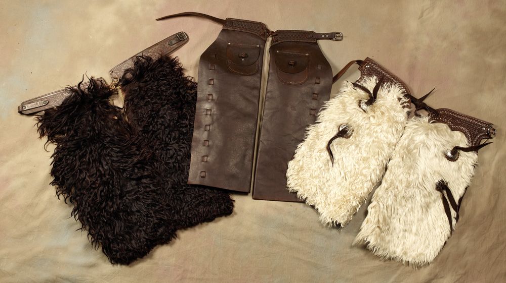 a) 22" black woolies by Clark. Canvas lined, probably made for a 4 year old. Canvas shortened in back, probably for comfort, but does not show from front. Leather carved billet and belt. c 1920-30s; b) 19" Buddie Foster white wooly chaps with 4 slotted conchos. Carved and studded billet. Suede back. Great condition; c) 22" dark brown leather chaps, leather trim woven down each side of batwing legs. Leather buttons on outside pockets, basket woven leather billet. Good condition, 1990s. To be sold to Benefit Collections for the Fort Worth Museum of Science and History