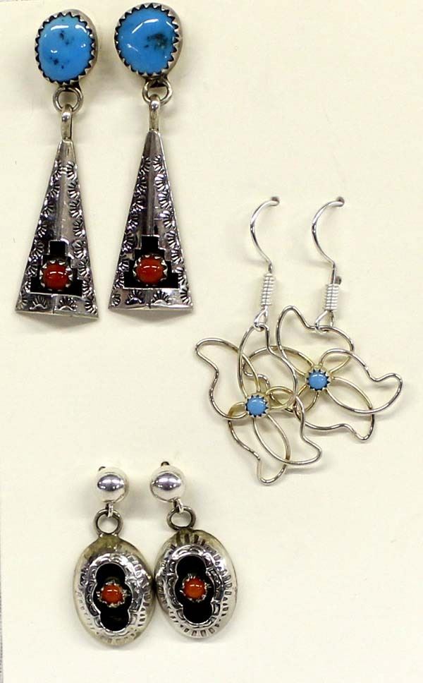 3 Pairs of Native American Navajo Silver Earrings, longest pair measures 1.75''L and are by Tommy Jackson