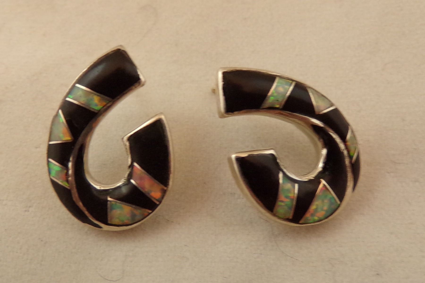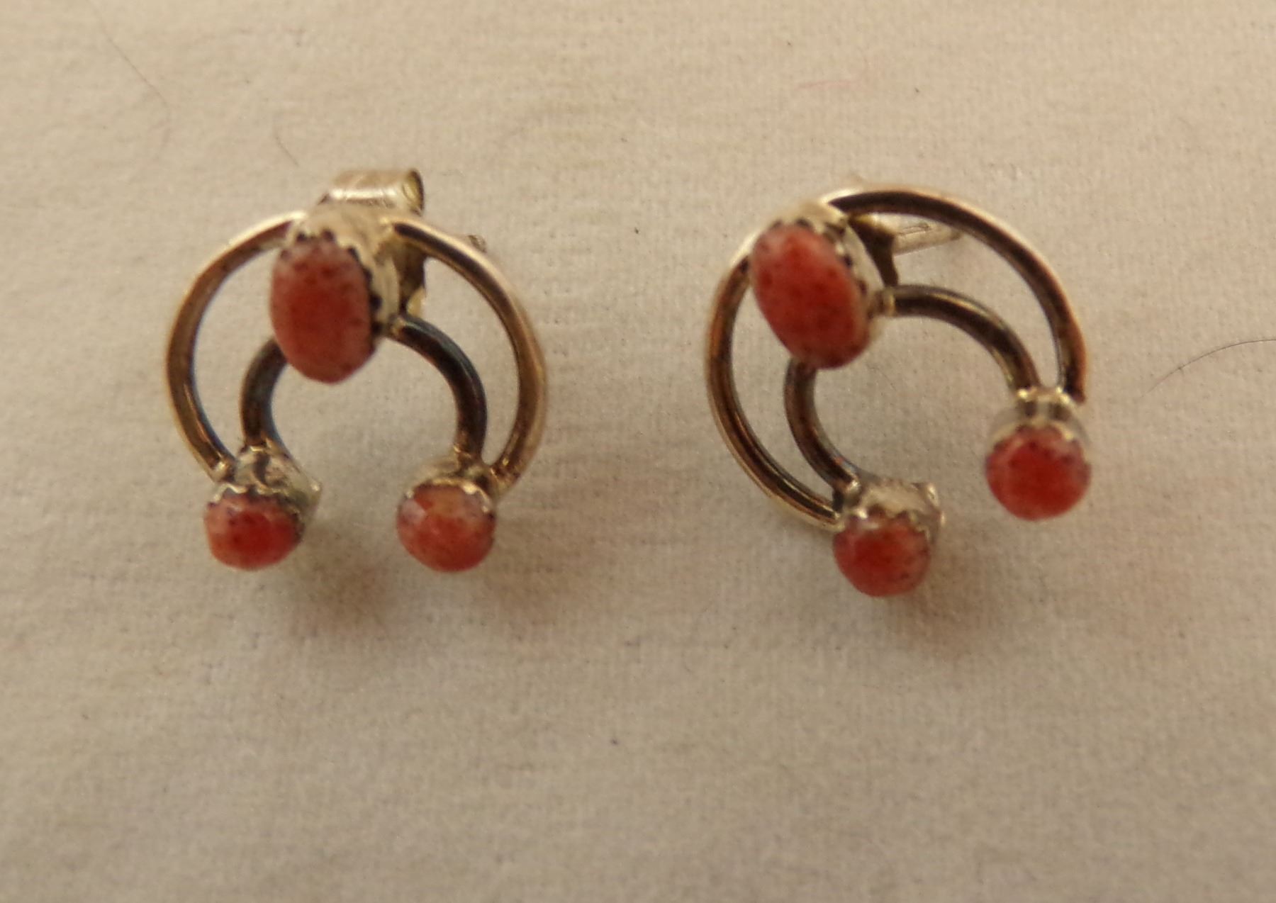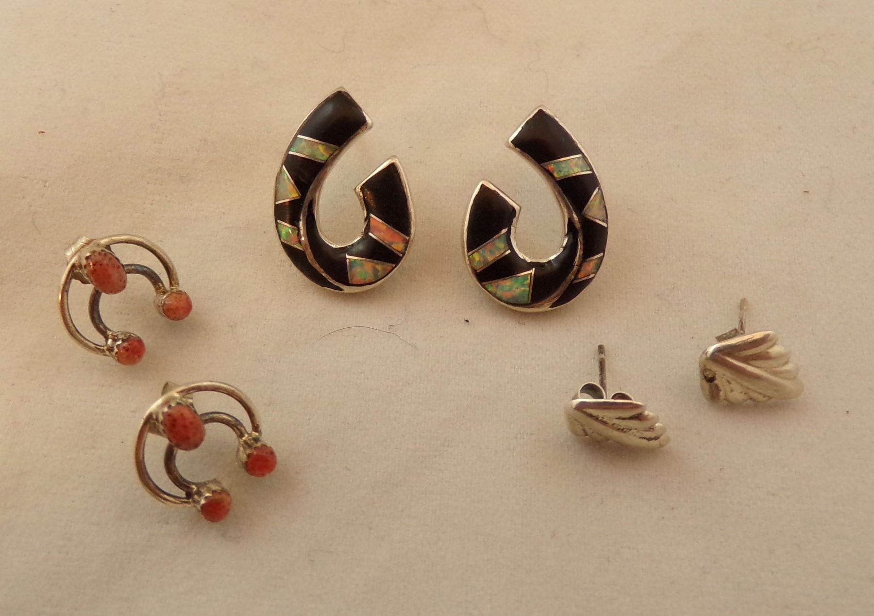3 Pairs of Native American Sterling Earrings, includes 1. Zuni Sterling Petit Point Angel Coral Post Earrings, measure .5'' x .5'' 2. Navajo Sterling Leaf Post Earrings, measure .5'' x 3/8'' 3. Navajo Sterling Inlay Earrings by Dan Whitegoat, hallmarked and stamped sterling, measure 7/8'' x 5/8'', inlay is opal and onyx
