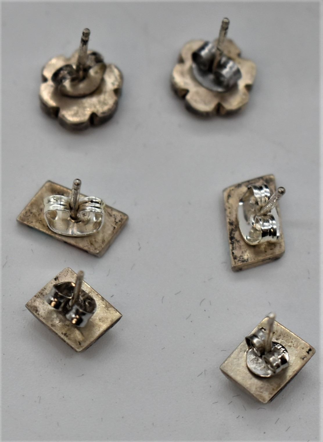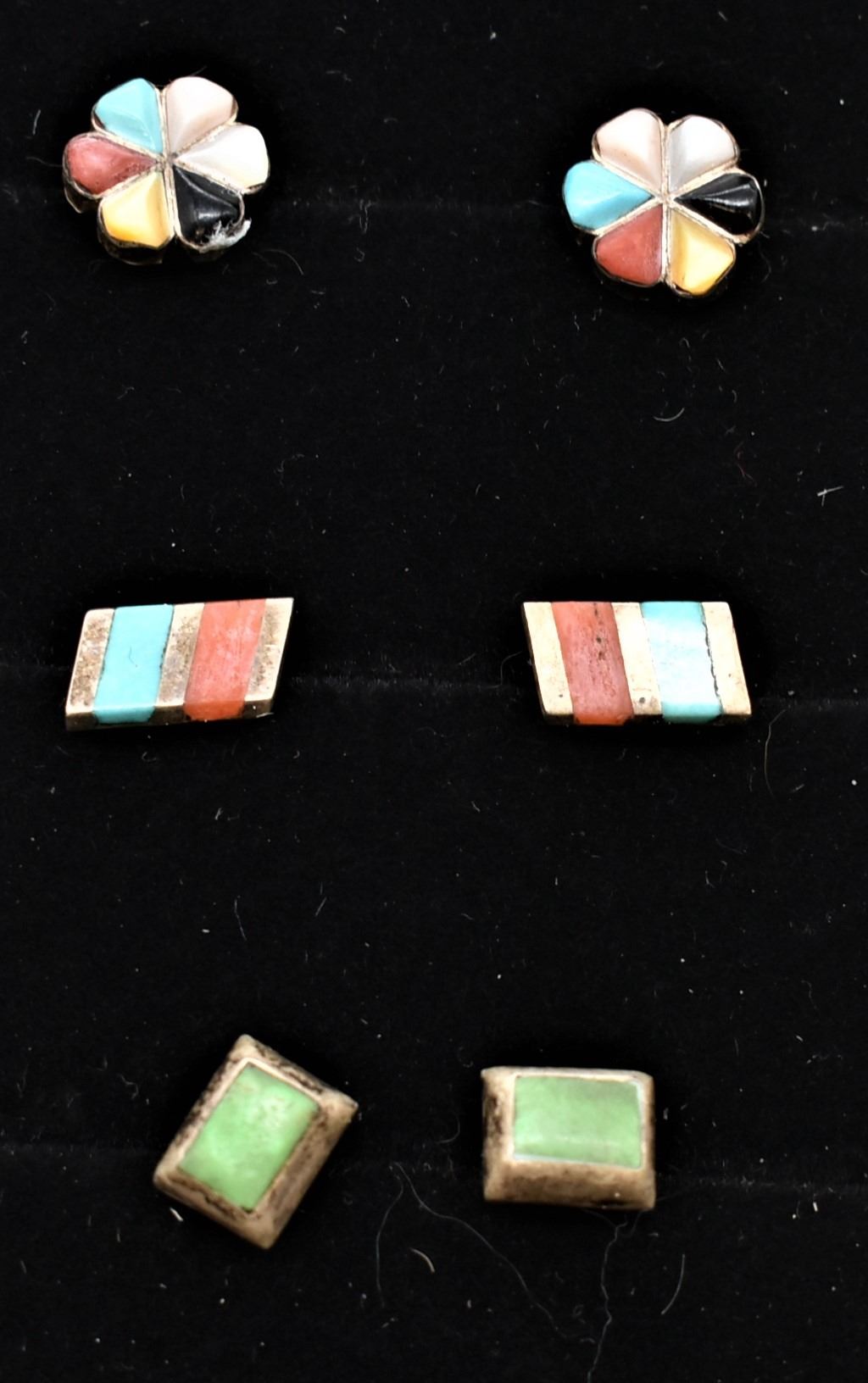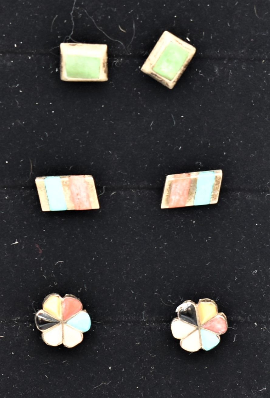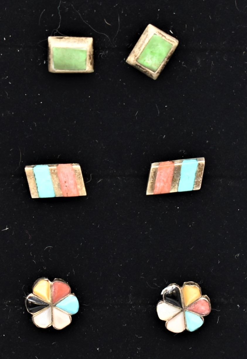 3 Pairs of Native American Estate Sterling Post Earrings, includes 1. Vintage Zuni Sterling and Inlay Multi-Stone Flower Shaped Earrings 2. Vintage Zuni Sterling Channel Inlay Turquoise and Coral Earrings, largest pair measuring 3/8'' x .25'' 3. Vintage Zuni Sterling Inlay Earrings