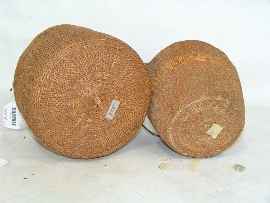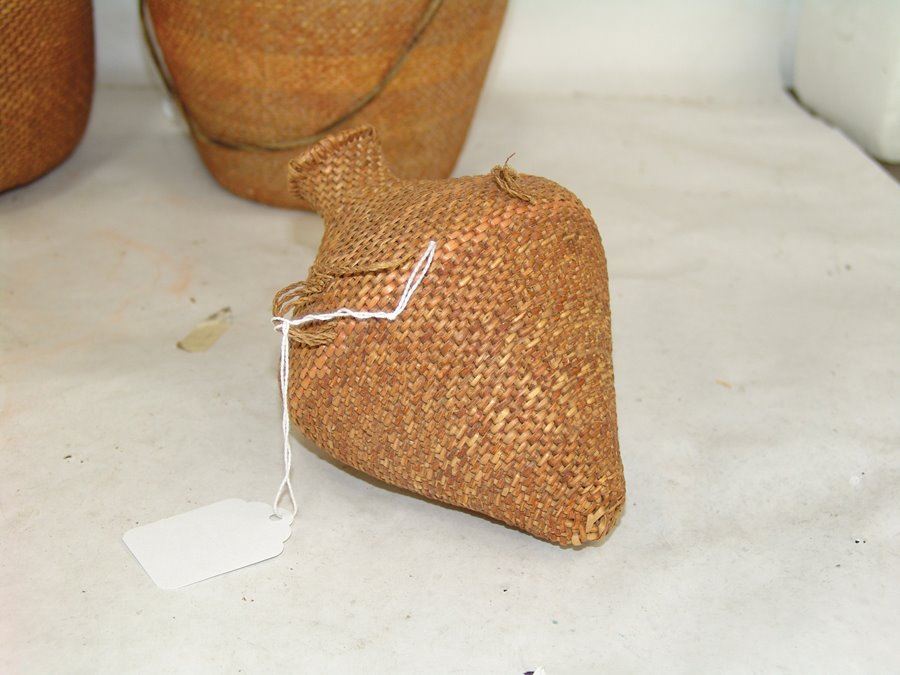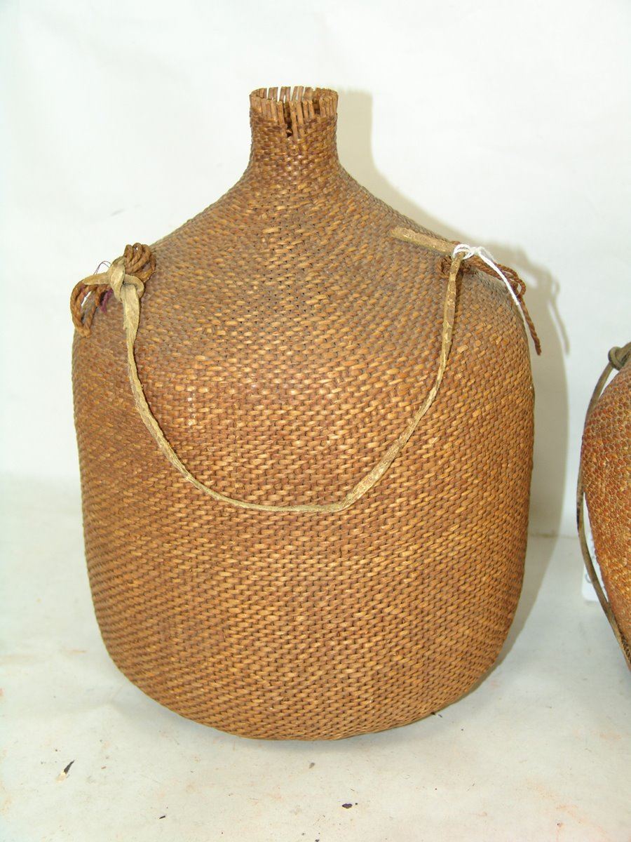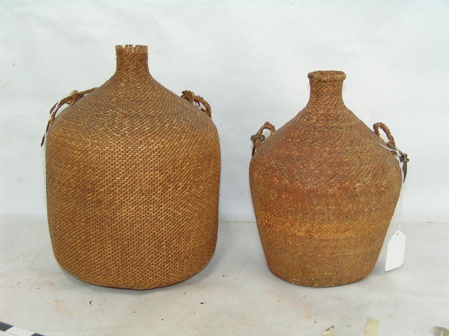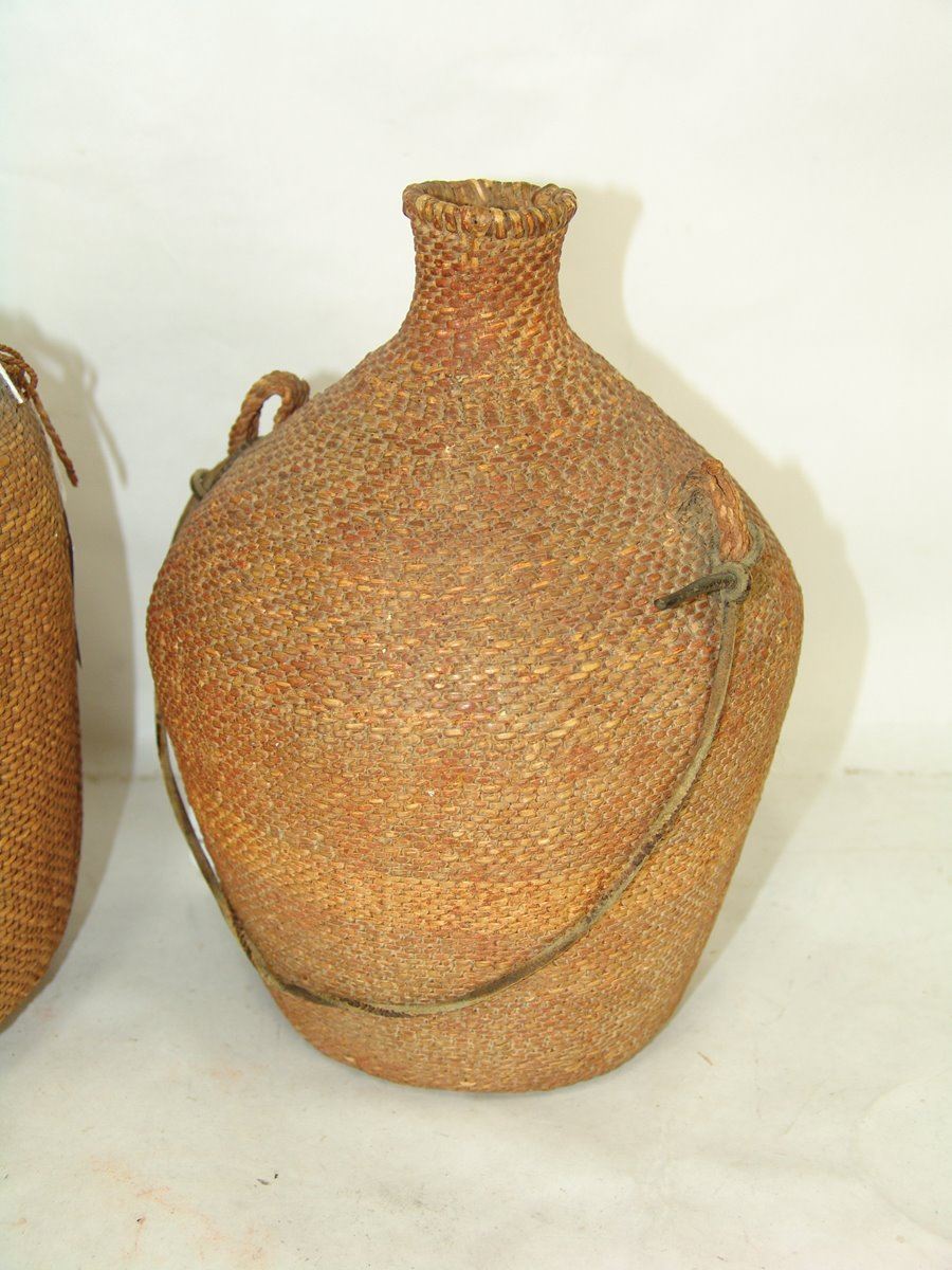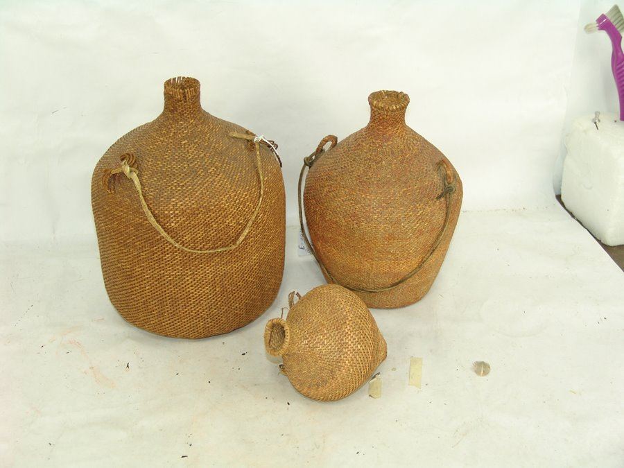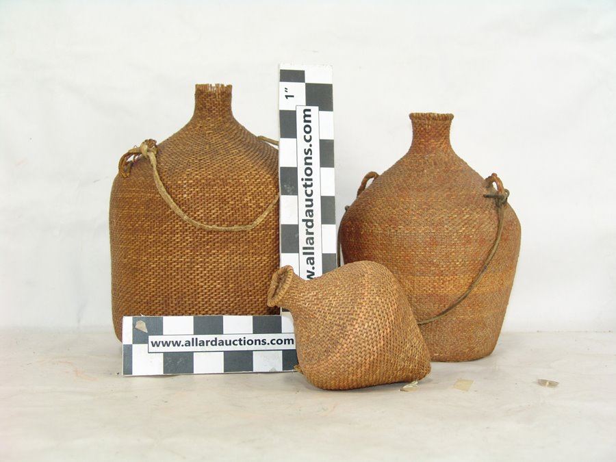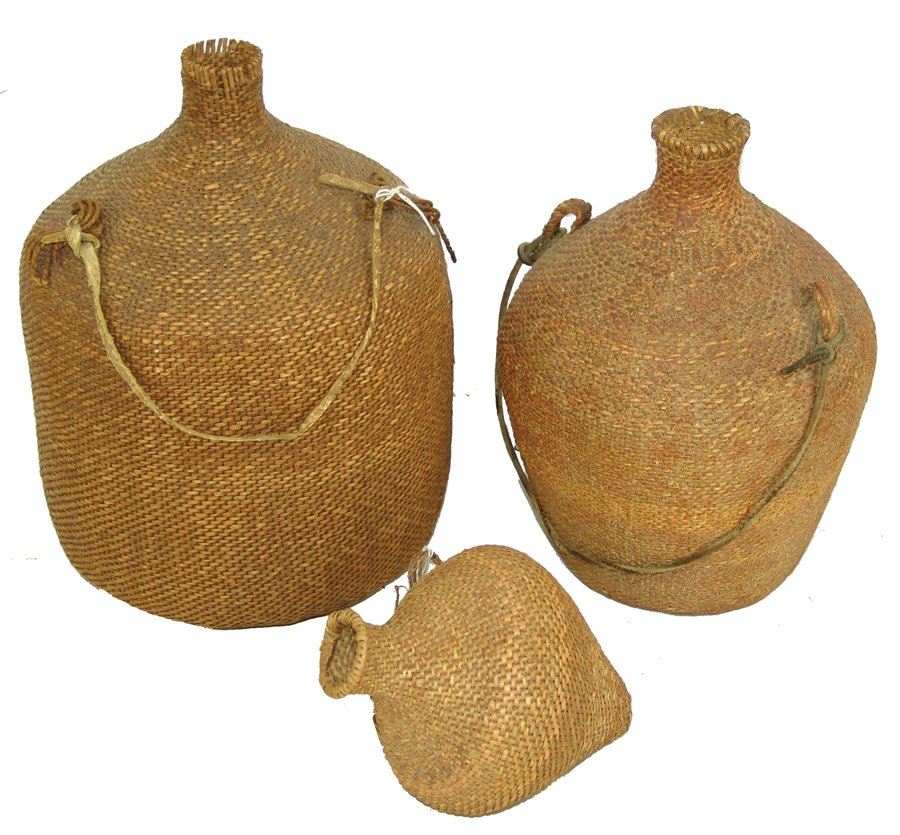 Set of three very fine twined-weave seed baskets with narrow spouts, two flat based and one conical, all with original lugs. All in remarkably good condition, one with some piñon pitch coating.,Early 1900s,11" x 8"