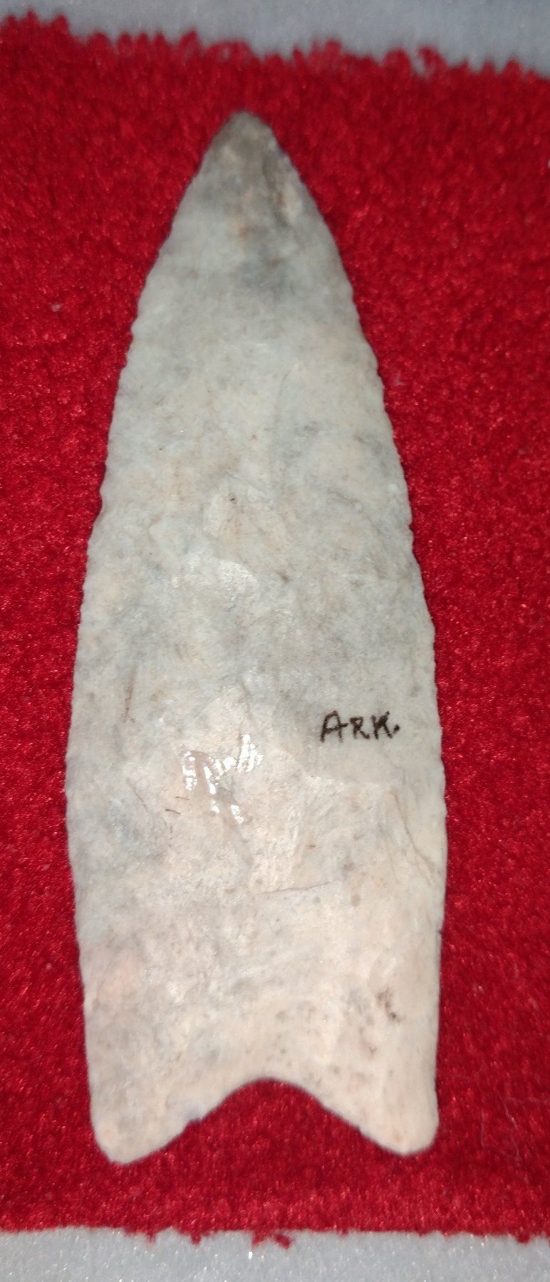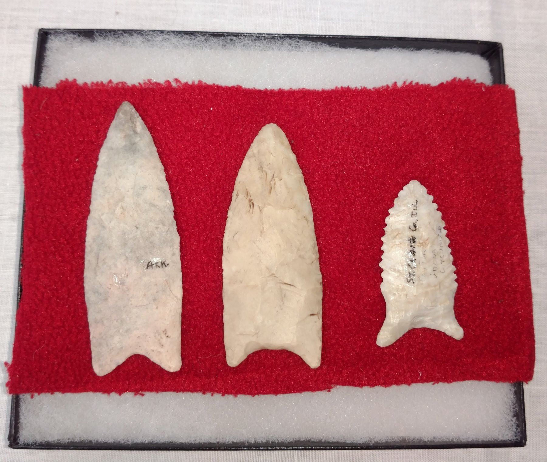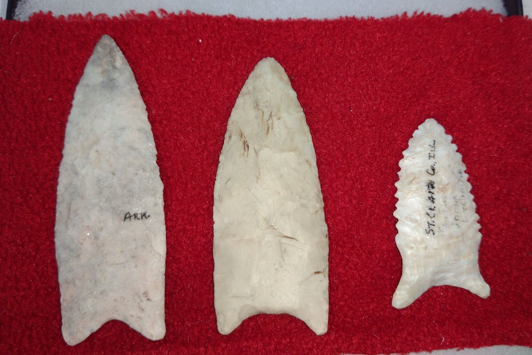 3 Paleo Points, pre-historic items. Made of chert, the longest measures 3 1/4". Arkansas & Illinois. Frame not included. Condition: Good, see images. Shipping: $15.50 w/insurance and signature.