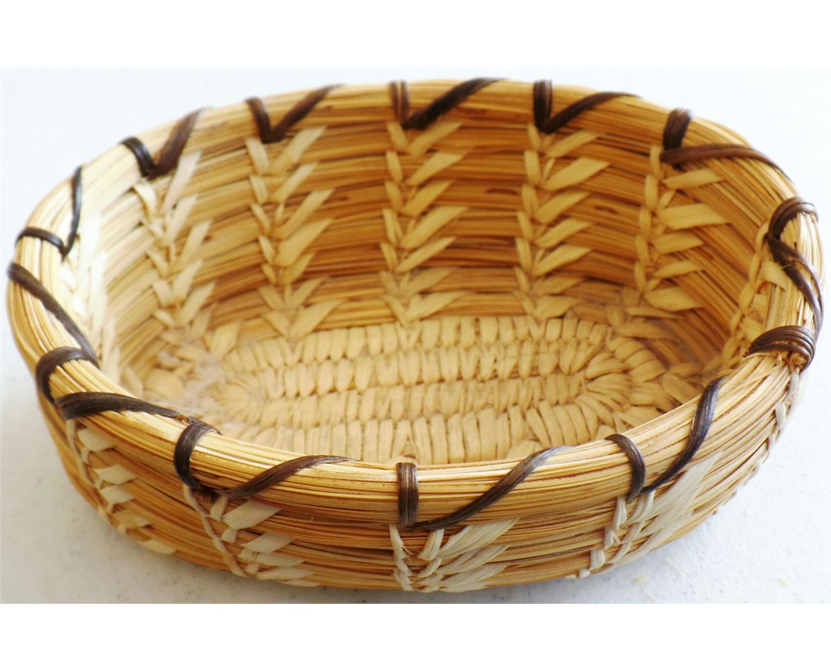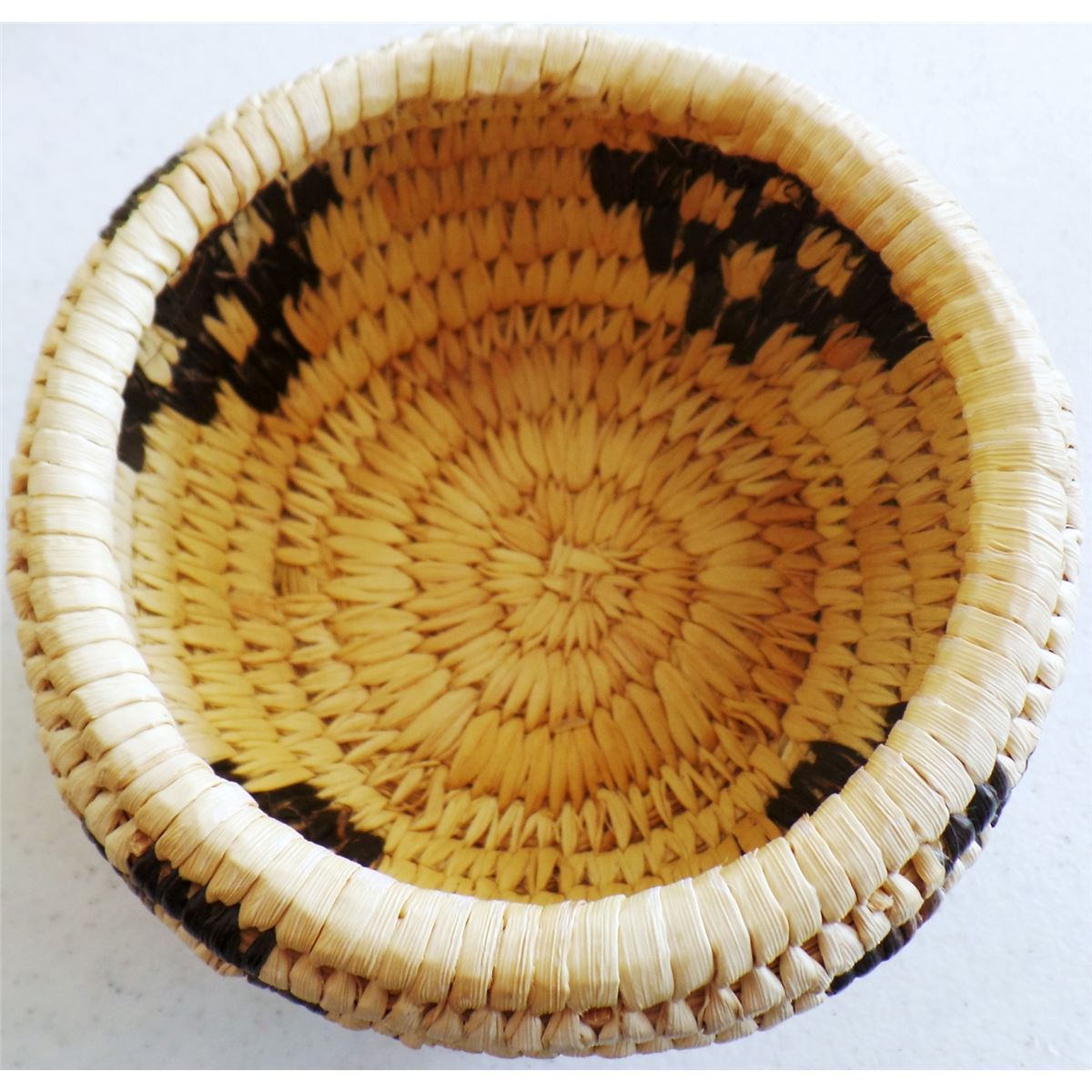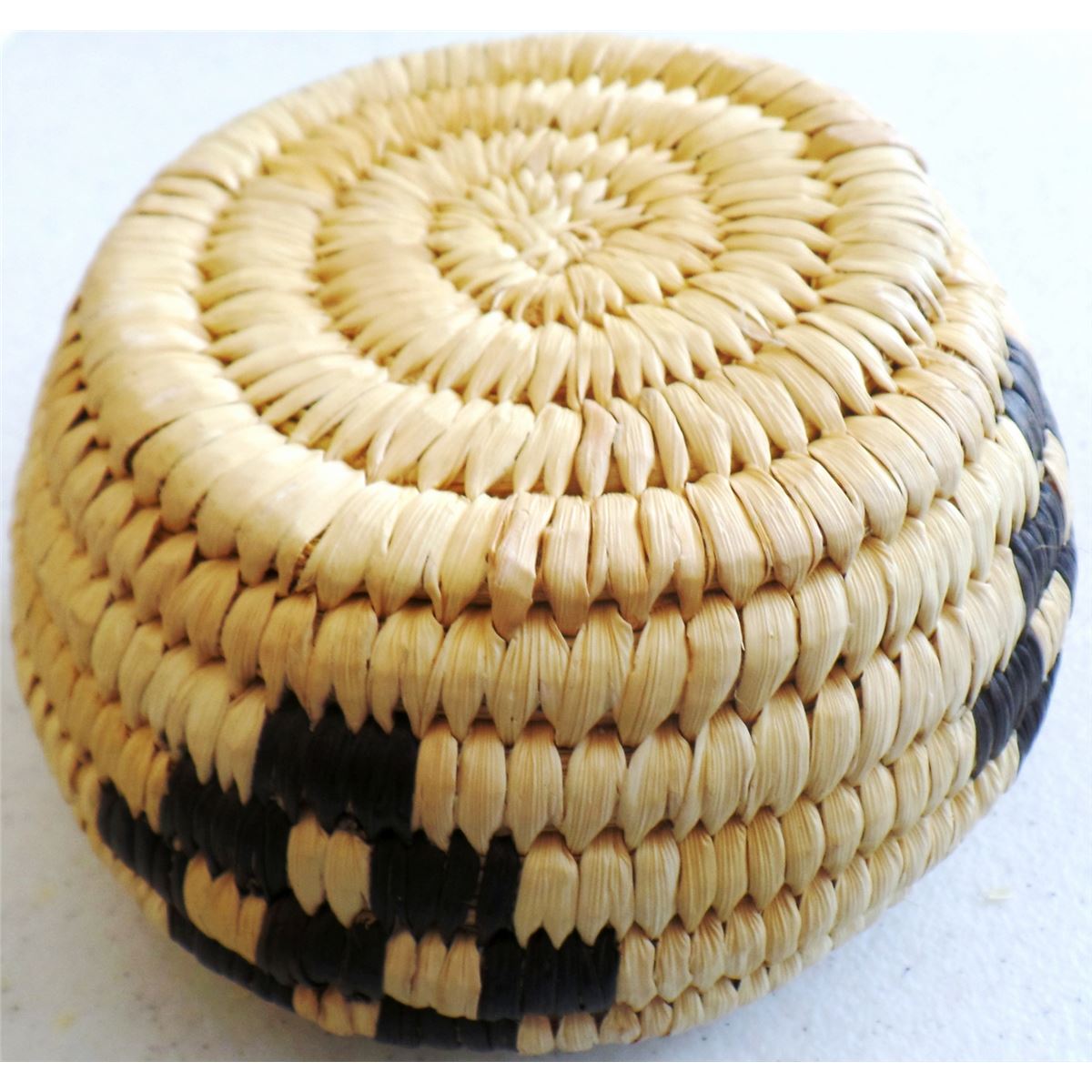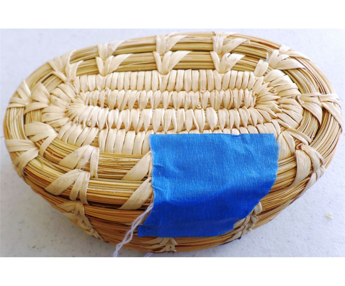 3 Papago Baskets, c. 1950s. Made of yucca, green yucca, beargrass, and devil's claw. Largest basket measures 3" x 5" tall, 4.5" x 2" tall, and lidded basket is 5" x 3.5" tall. Condition: Nice, see images. Shipping: $18.00.