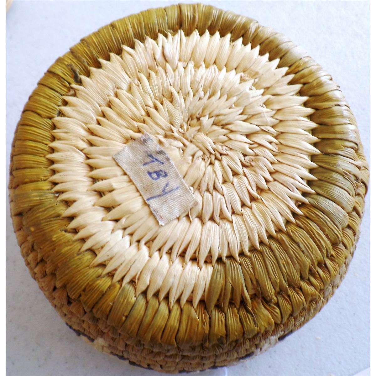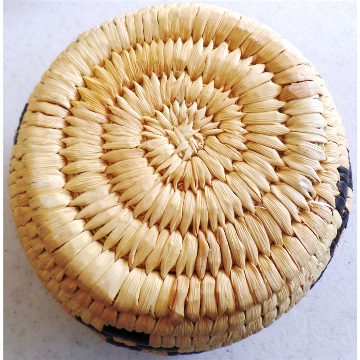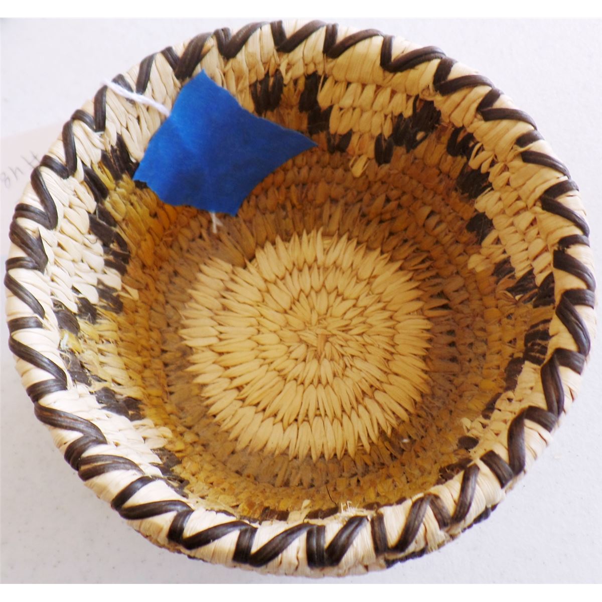 3 Papago Baskets, c. 1950s. Made of yucca, green yucca, beargrass, and devil's claw. Largest basket measures 3" x 5" tall, 4.5" x 2" tall, and lidded basket is 5" x 3.5" tall. Condition: Nice, see images. Shipping: $18.00.