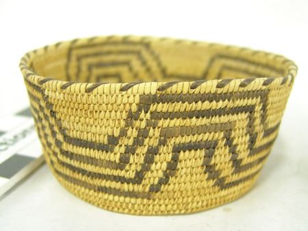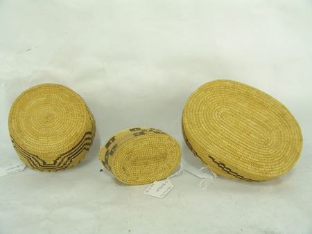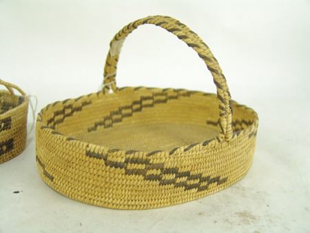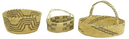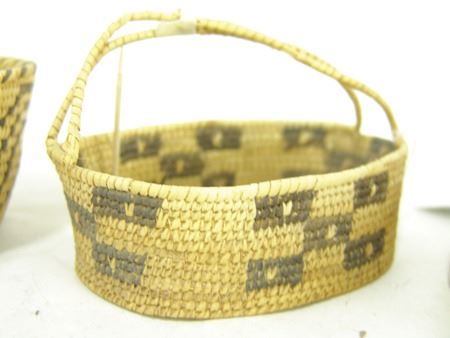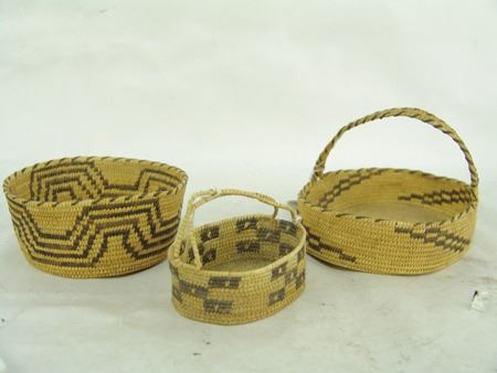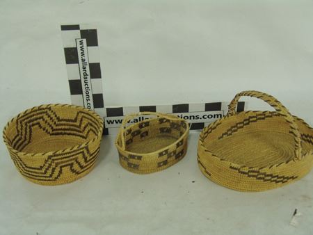 Mid 1900s, Group of three very fine weave Papago baskets, two with handles, one a bowl with geometric design. All three in good condition (both handles have repairs). Largest 7" x 5-3/8" x 4-1/2"