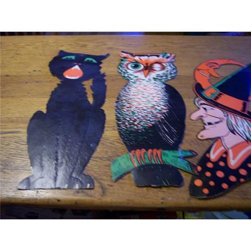 This is a set of three paper Halloween decorations.They witch is markedCopr.H E Luhrs.The other two are not marked but all came together.3 pieces of tape on the cat and the tree limb has been taped on the back because of damage.The owl is 22" tall,the cat is 23 1/8" tall and the witch is 23" tall.Great colors.Considering the age these are in good condition for paper items.