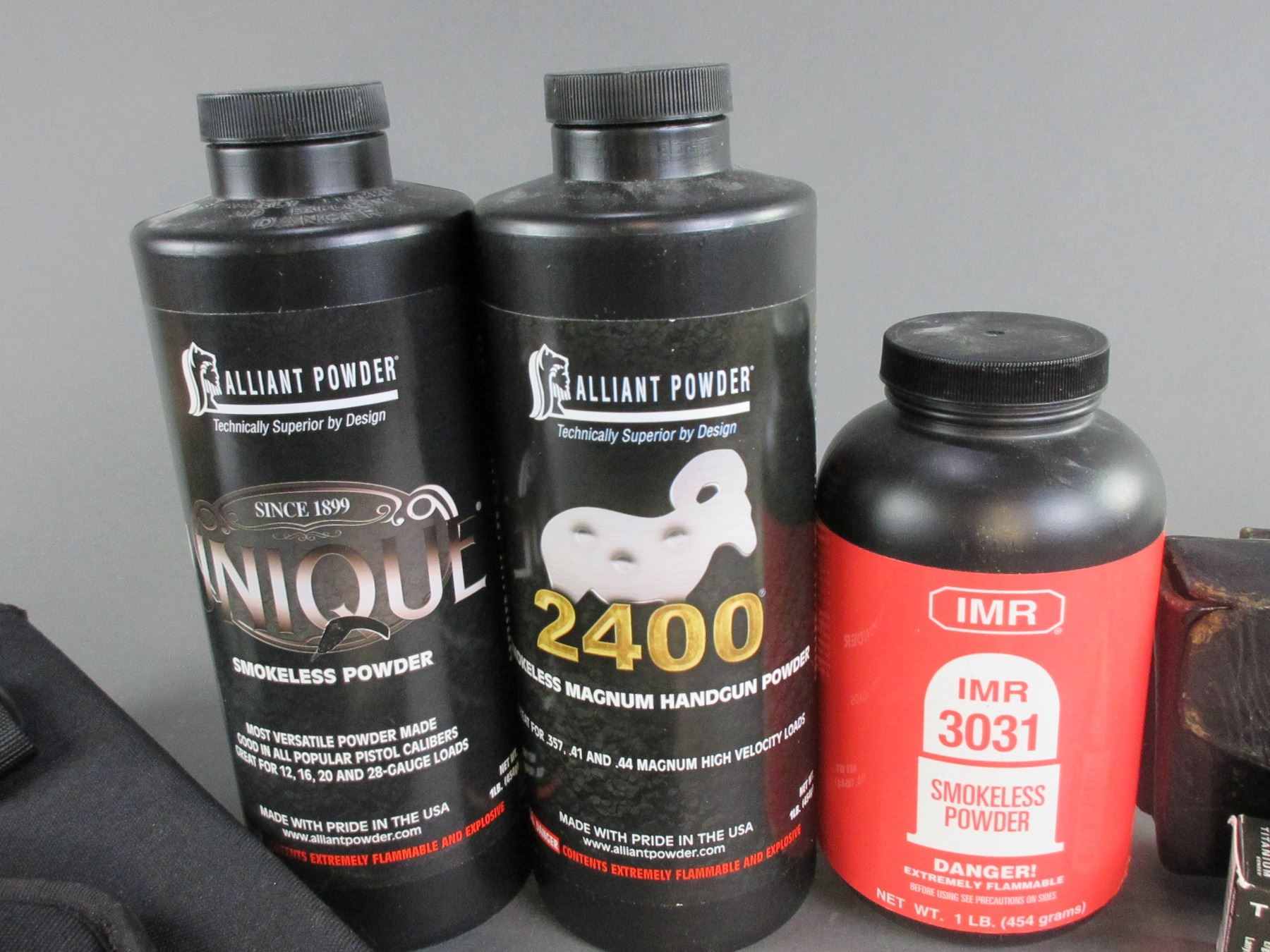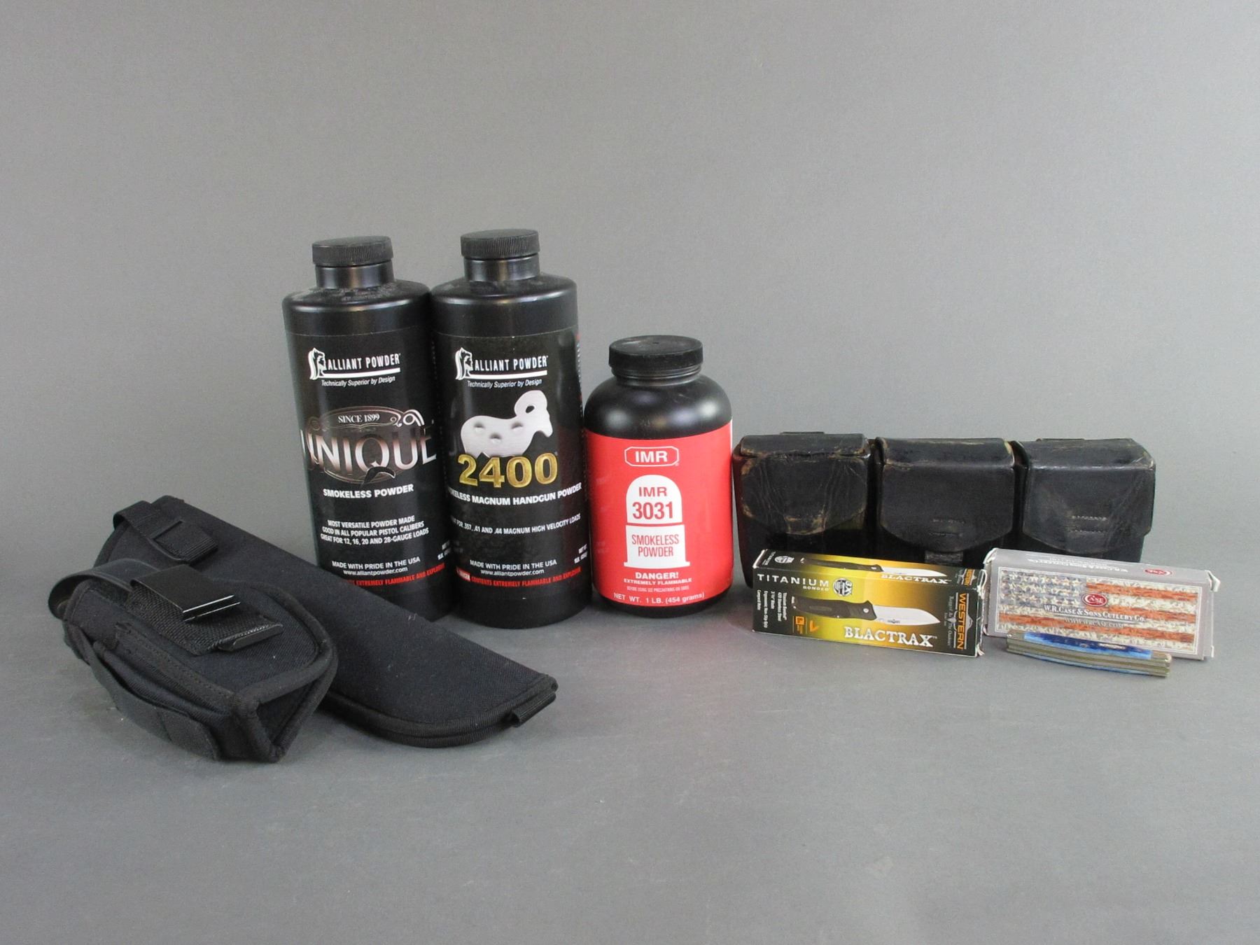 3 Partial Cans Of Smokeless Powder- 2 Holsters- 3 Ammo Pouches- Knife- Patches