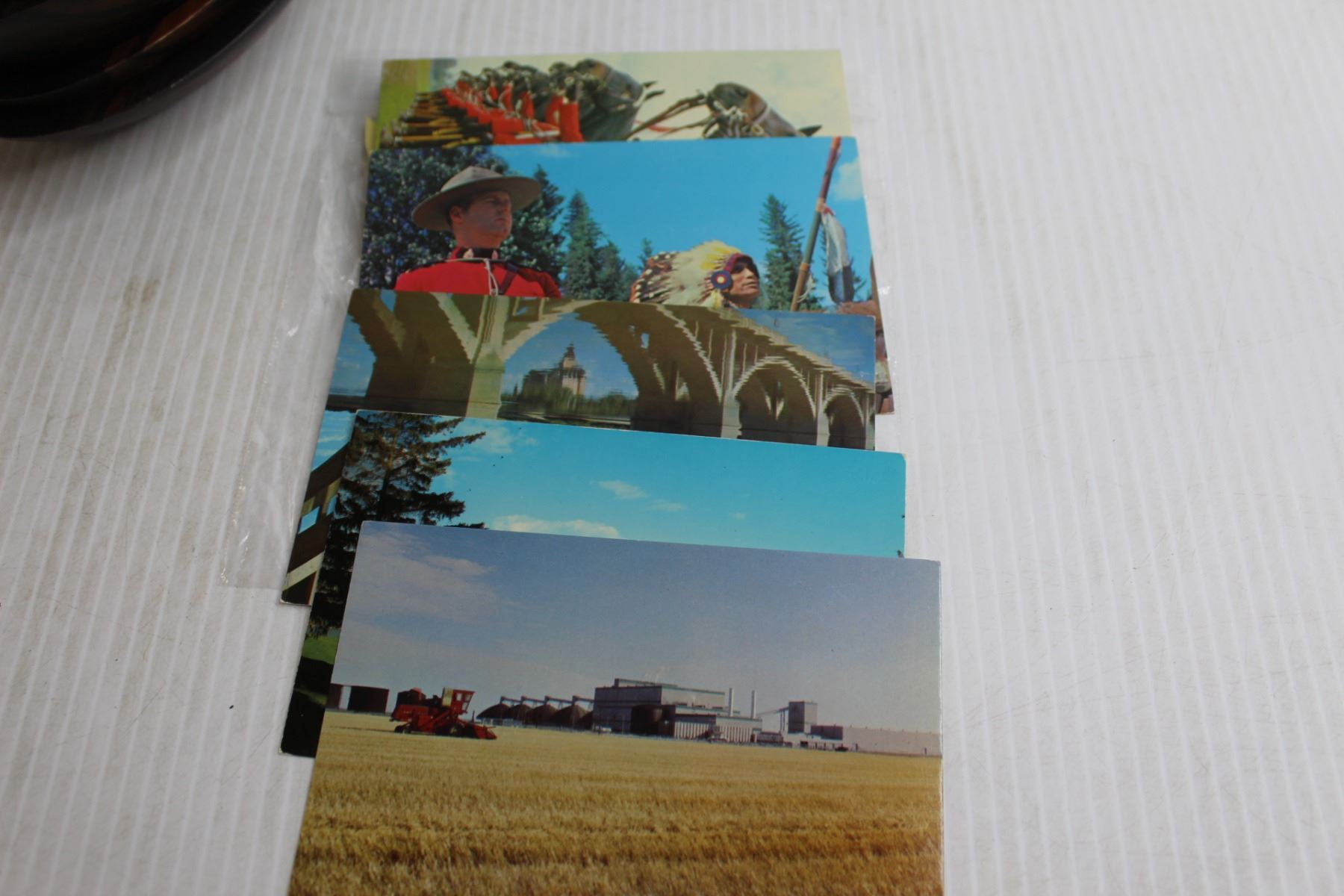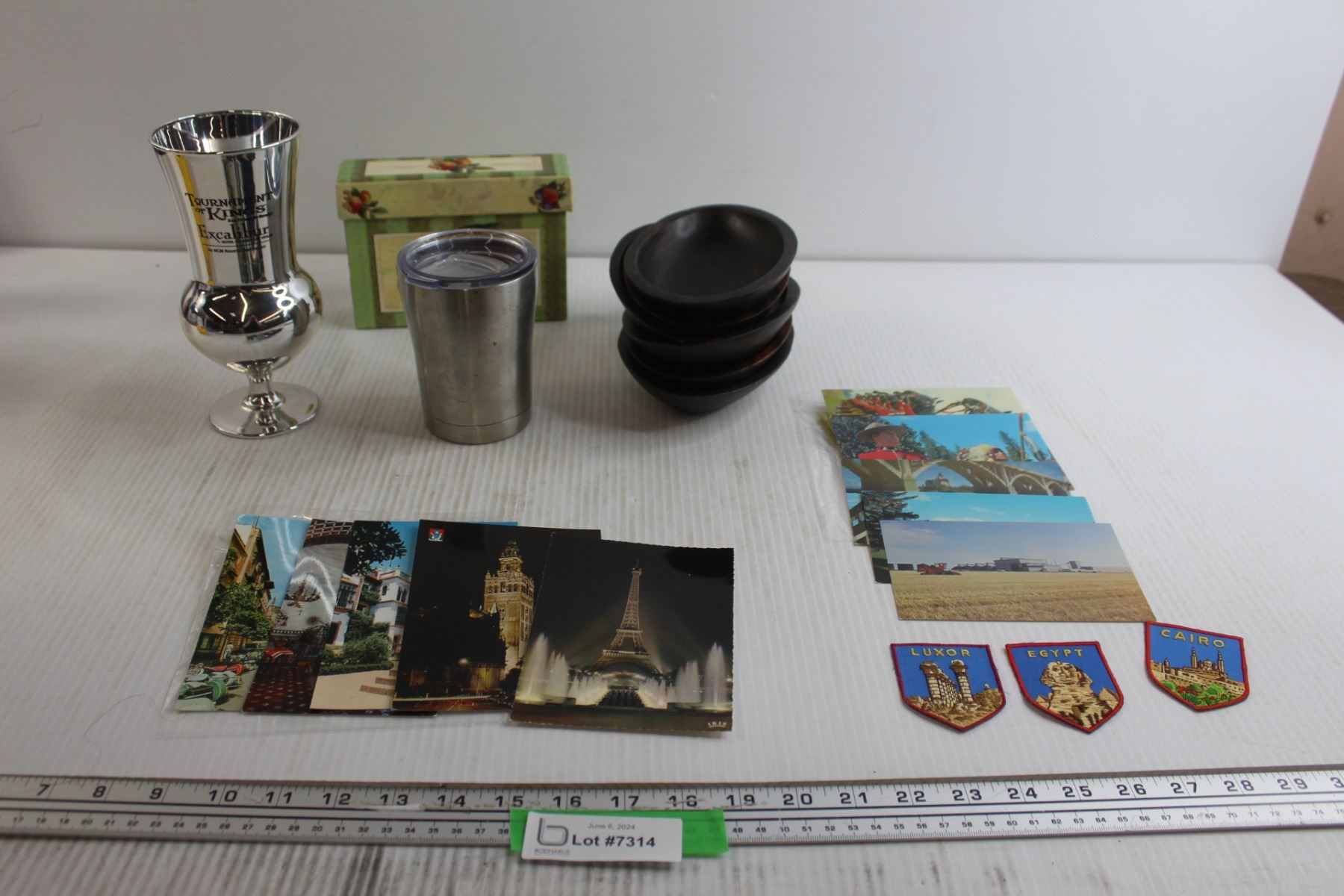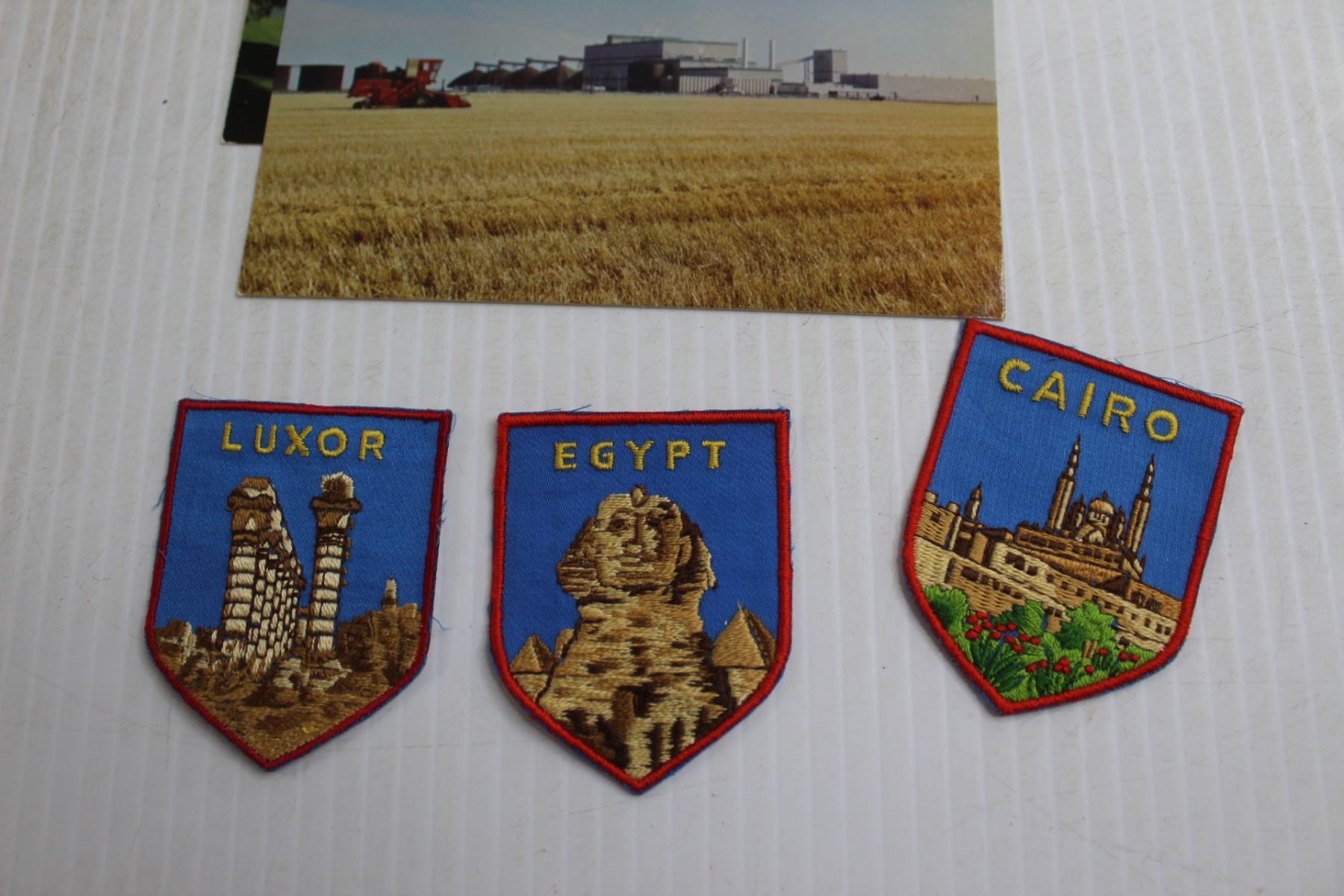 (3) Patches, (10) Postcards, (6) Wooden Small Oval Plates, Misc.