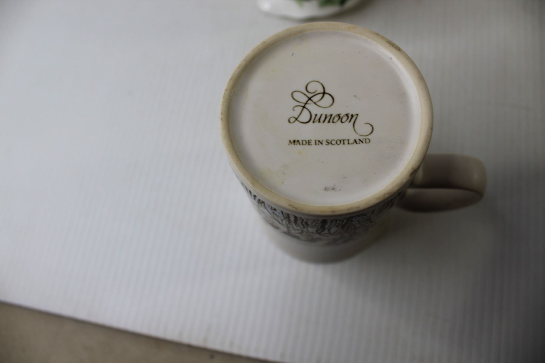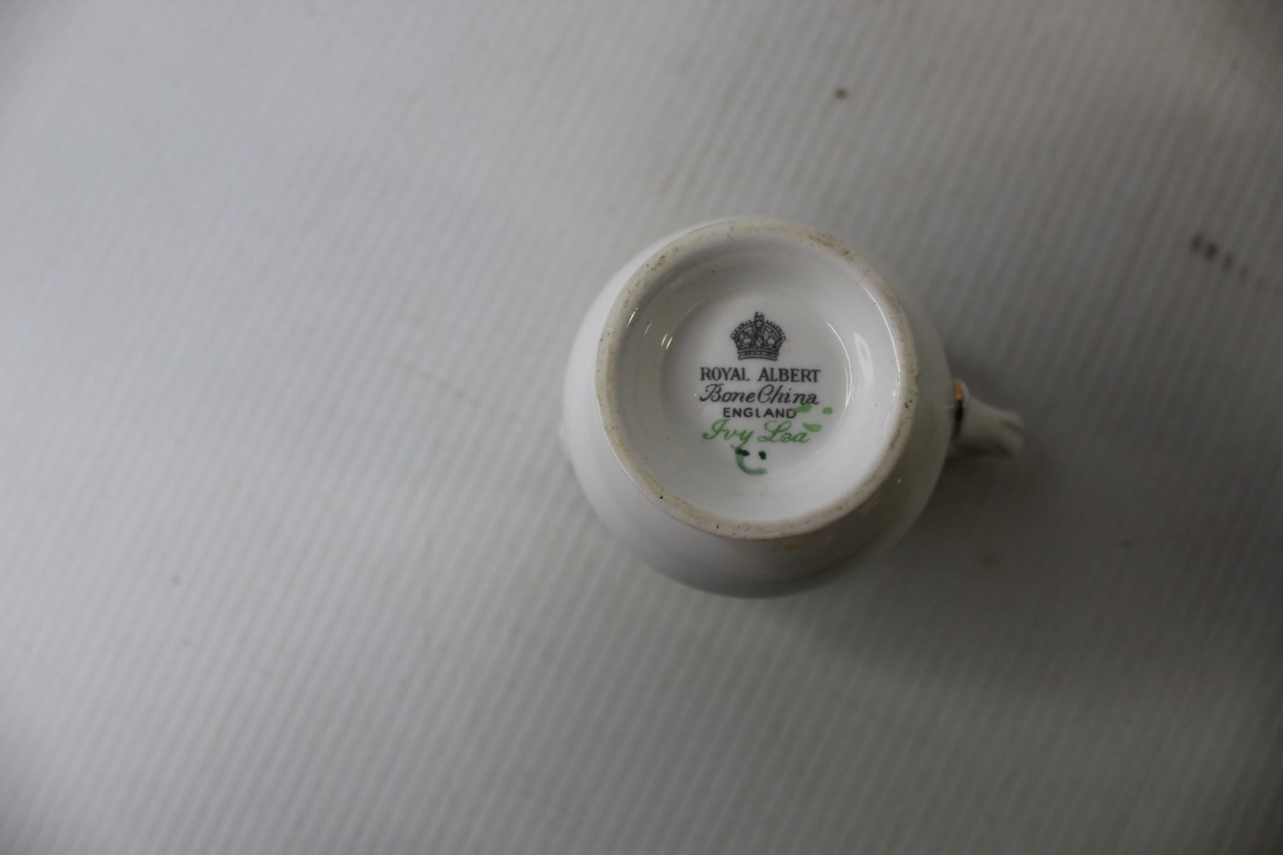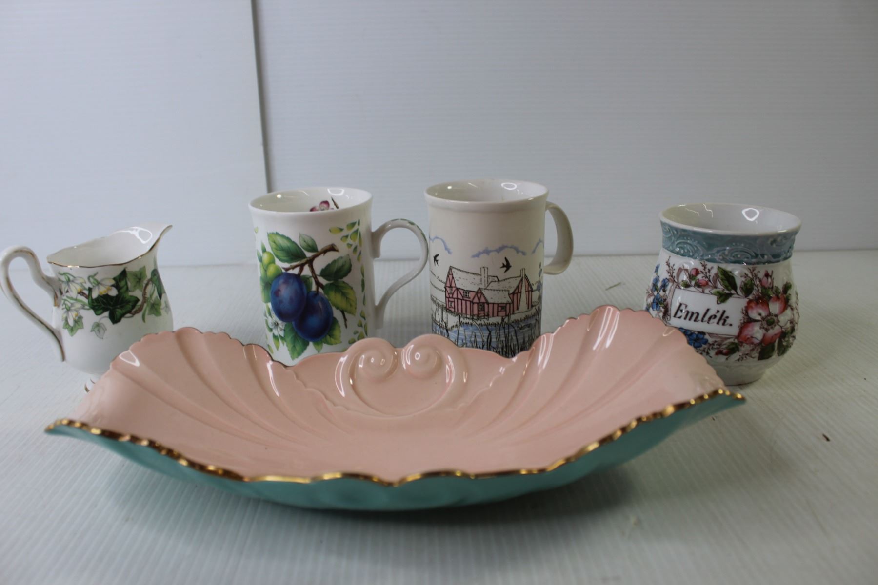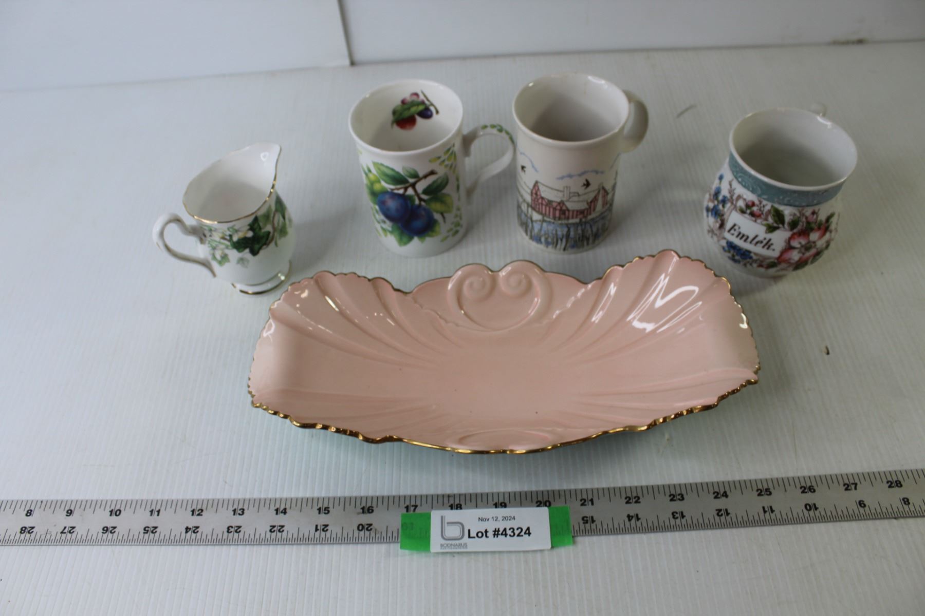 (3) Patterned Coffee Mugs, Fine China Creamer, Ceramic Decorative Dish With Gold Color Edging