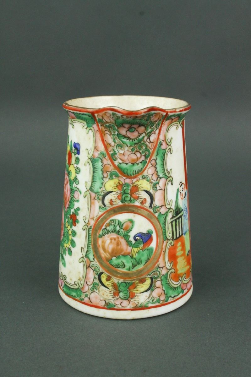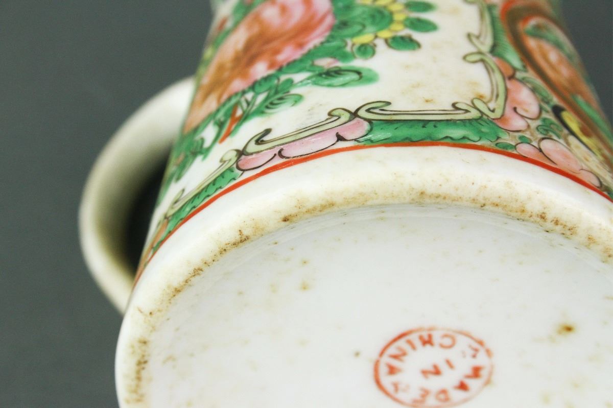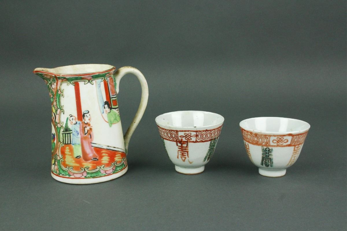 Three pieces of Chinese Canton rose medallion porcelain pitcher and cups; enameled with panels of figural scenes; H: 10 cm, Cup H: 5 cm, D: 8 cm, Cup D: 7 cm, 316 grams total