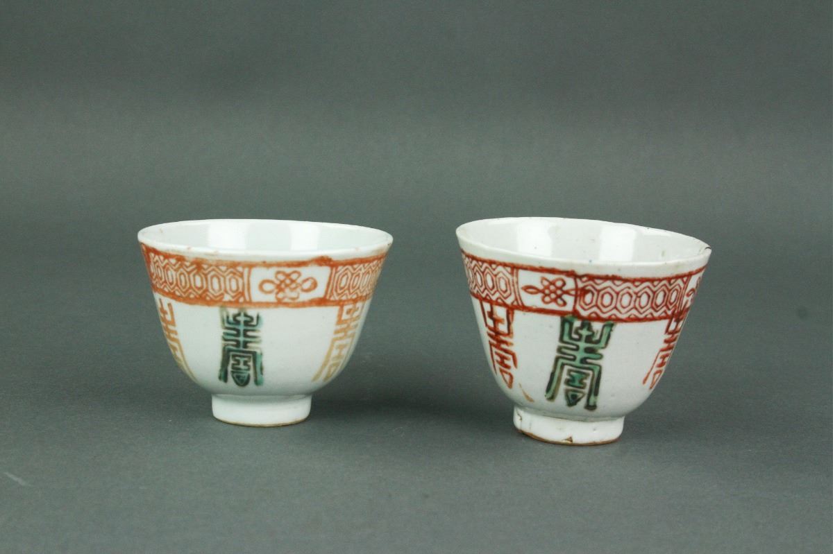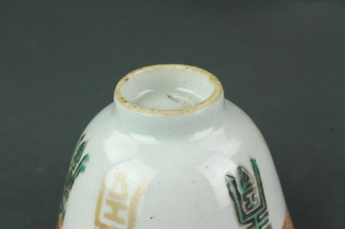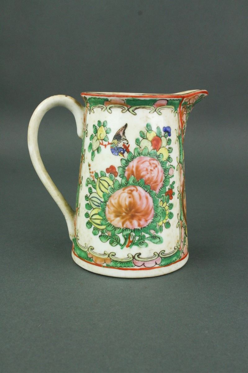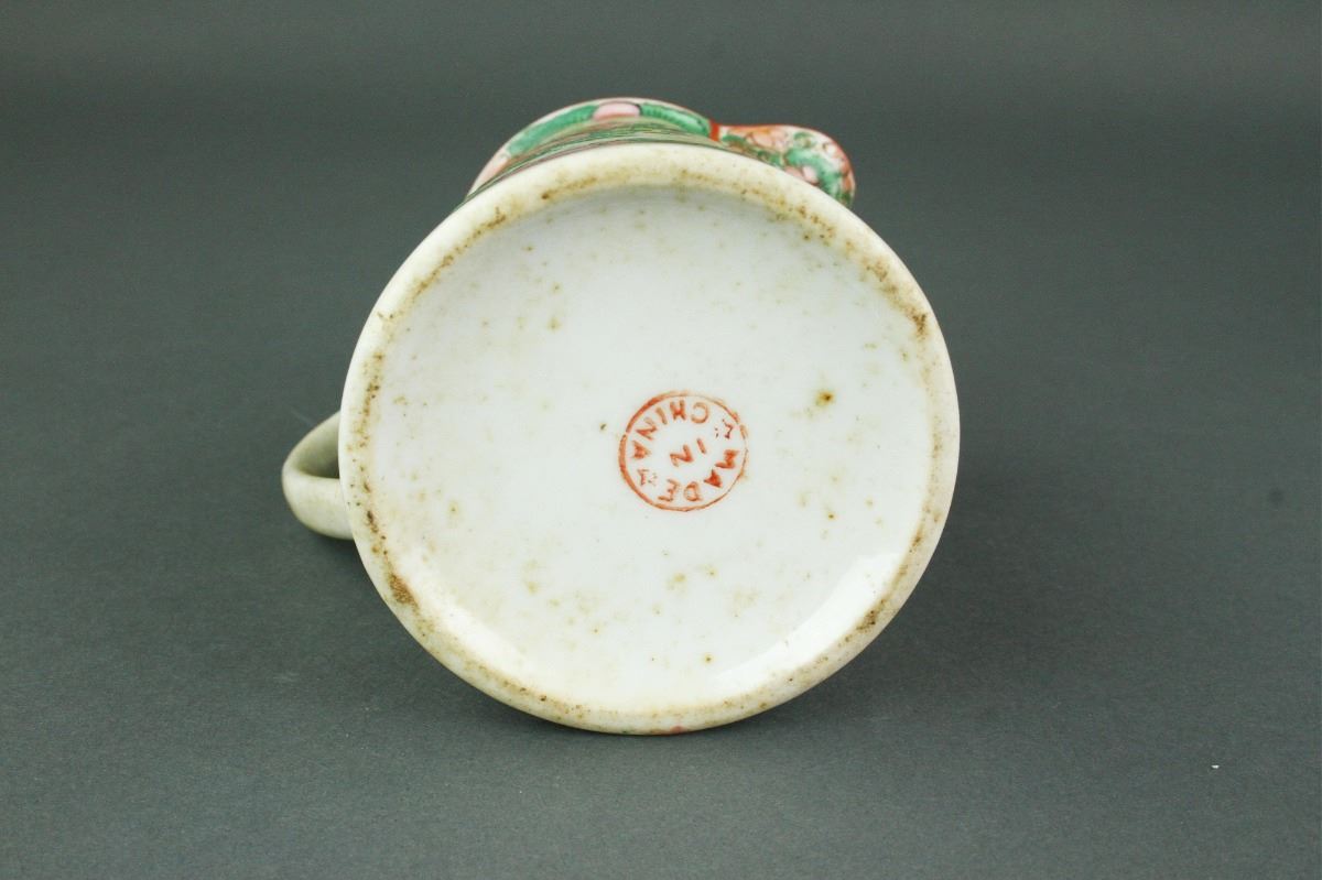 Three pieces of Chinese Canton rose medallion porcelain pitcher and cups; enameled with panels of figural scenes; H: 10 cm, Cup H: 5 cm, D: 8 cm, Cup D: 7 cm, 316 grams total