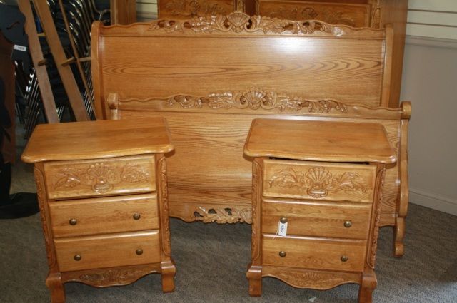 3 Pc Carved Oak Sleigh Bed and 2 Bedside Tables