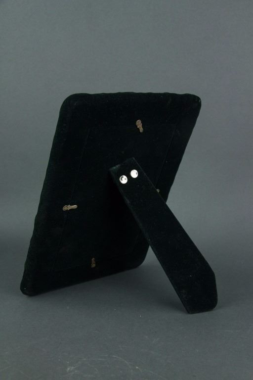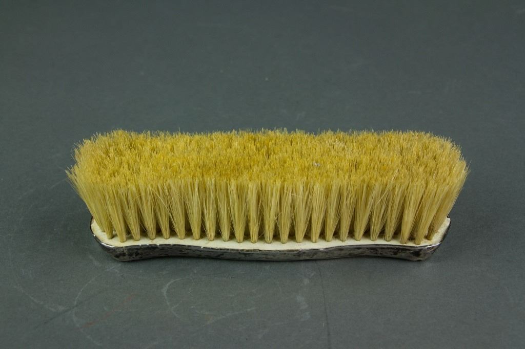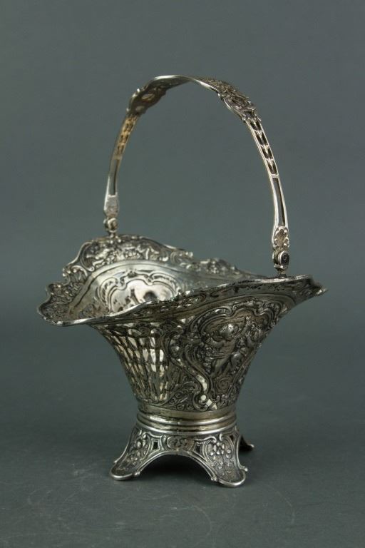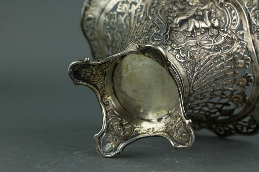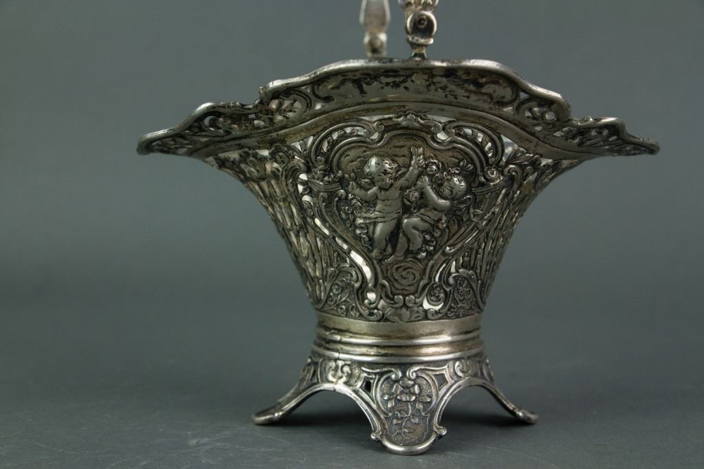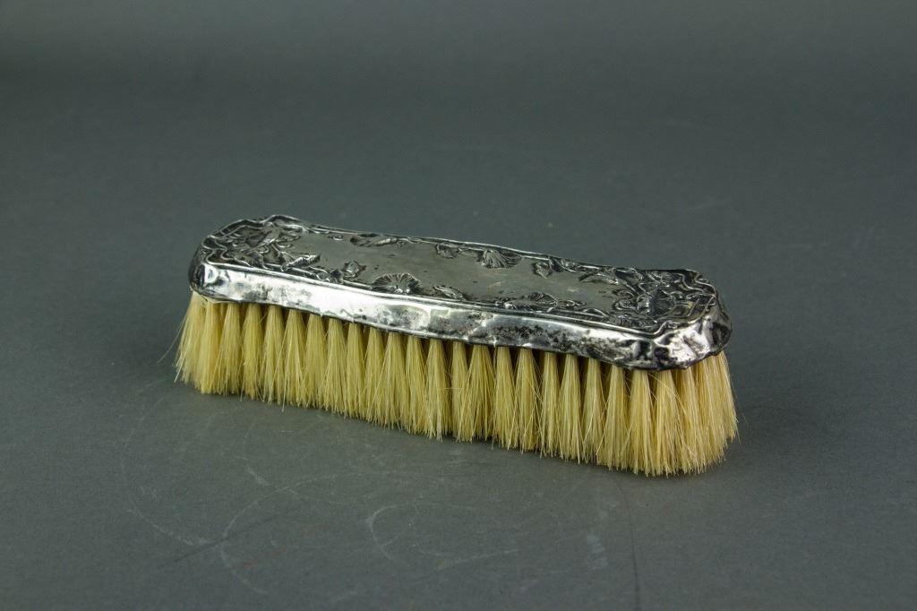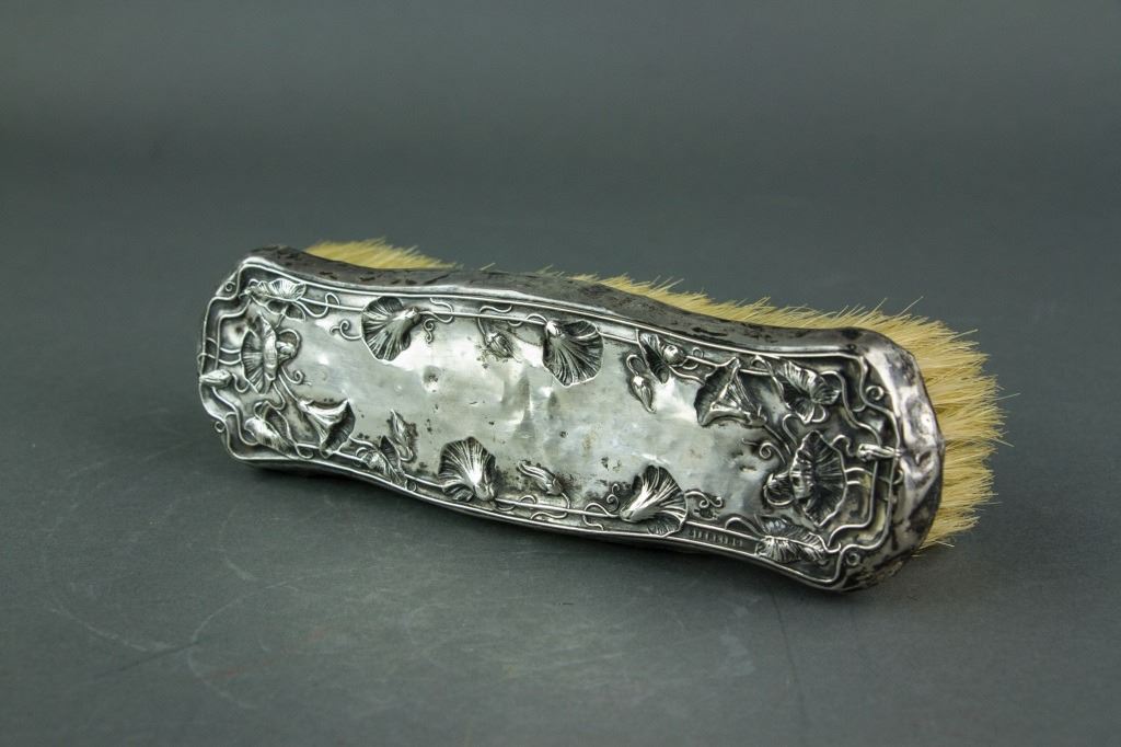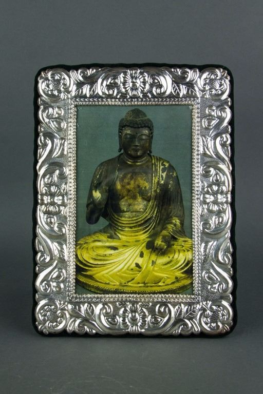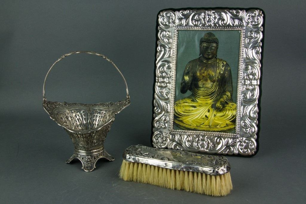 Three pieces of European style silver items; tripod silver basket with open work carving and handle; clothing brush with silver handle; silver photo frame with leafy pattern and a Buddha picture in it; basket: H: 19 cm, L: 14 cm, 206 grams; frame: 24.5 x 18.5 cm, 584 grams; brush: H: 4 cm, W: 5 cm, L: 16.5 cm, 93 grams