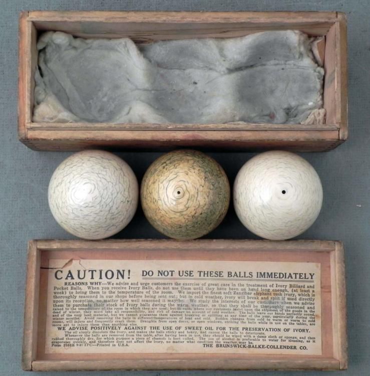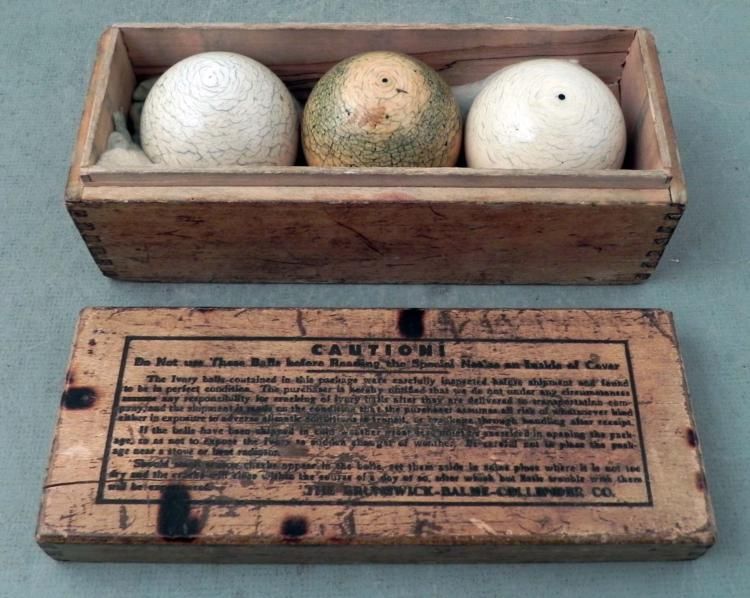 This is a 3 piece set of ivory carom billiard balls. They are antique, and were made by Brunswick-Balke-Collender Co. All three are white, and two have inlaid black dots. One is darkened from age. Their condition is good to very good, showing normal age and wear. Their size is 2 7/16 inches, as stamped on the bottom of the box. They come in the original wooden box, which is 8 1/2 x 3 1/2 x 3 inches. It has imprinted instructions on the lid, and paper instructions pasted inside the lid. The box has some spotting, and minor crack on the lid. The text describes the balls as being made from the finest soft Zanzibar elephant tusk ivory.These will be excellent to display in your parlour or billiards room.