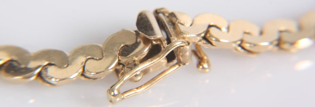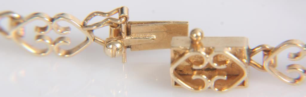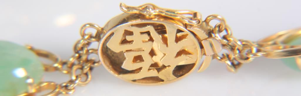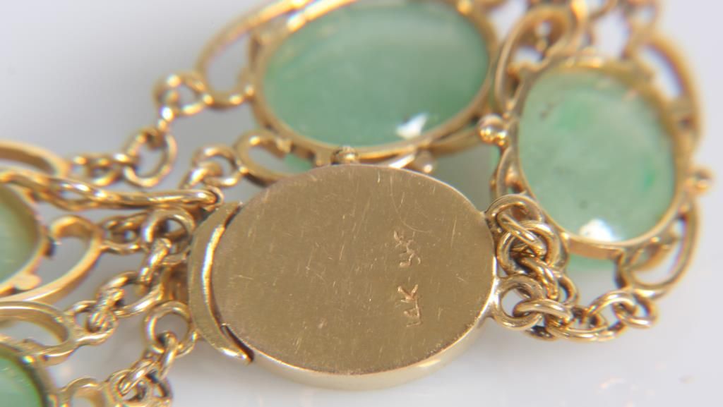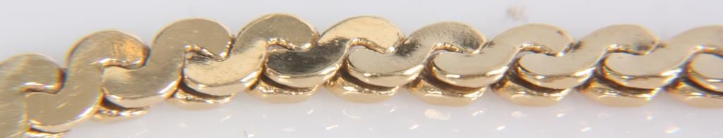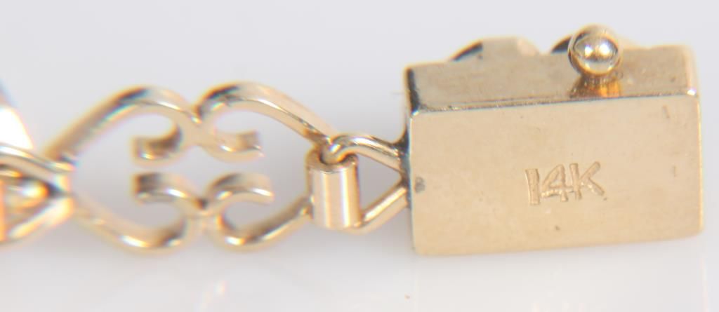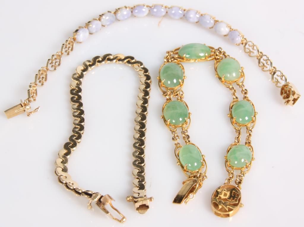 3 Pcs. 14K Gold Bracelets. Marked 14K gold bracelet has an S-link design, marked on the clasp and measures 7.5 in. long. Marked 14K yellow gold bracelet has a pierced clasp with Chinese lettering and 7 links with oval