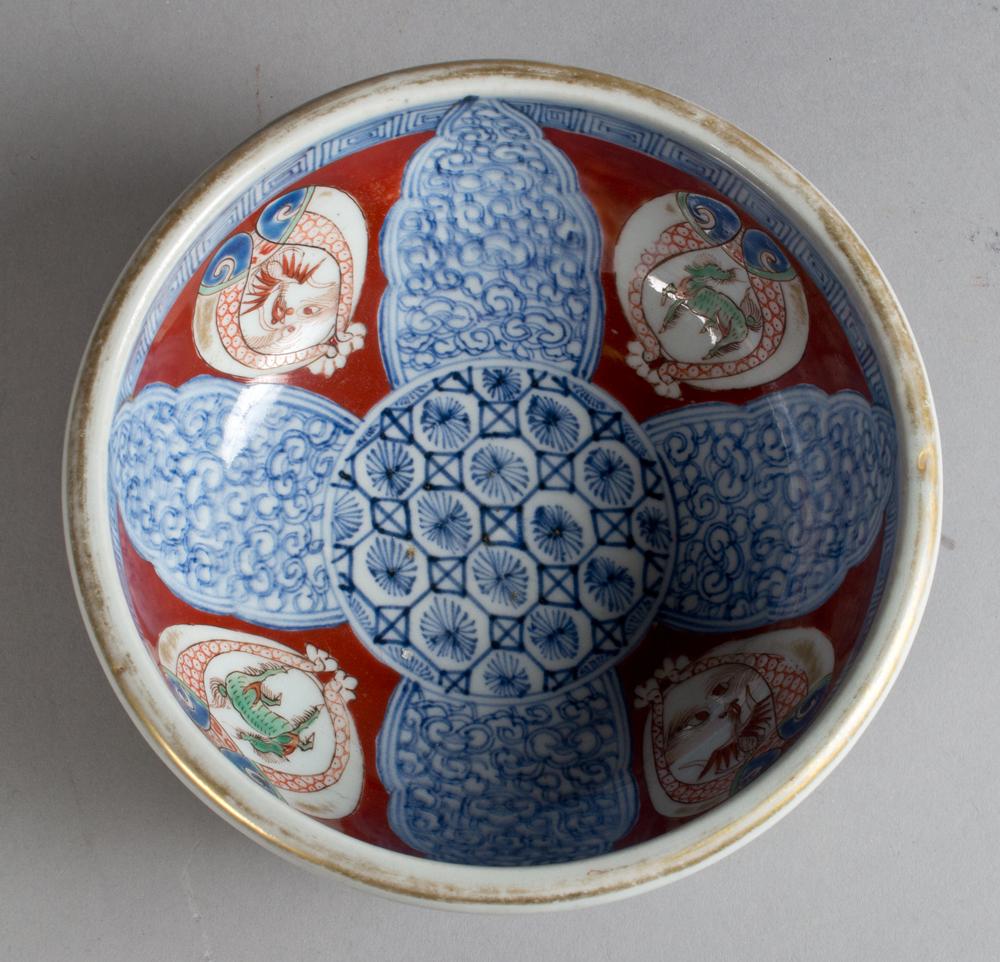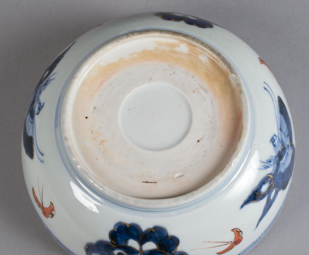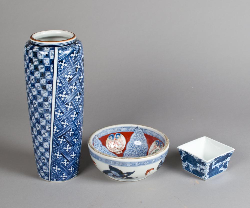 To include a high sided imari bowl decorated with butterflies and two arita wares to include a tall cylinder vase signed with three character mark and a square bowl signed with character mark to base, tallest is 11.75"H, circa early 20th century.
