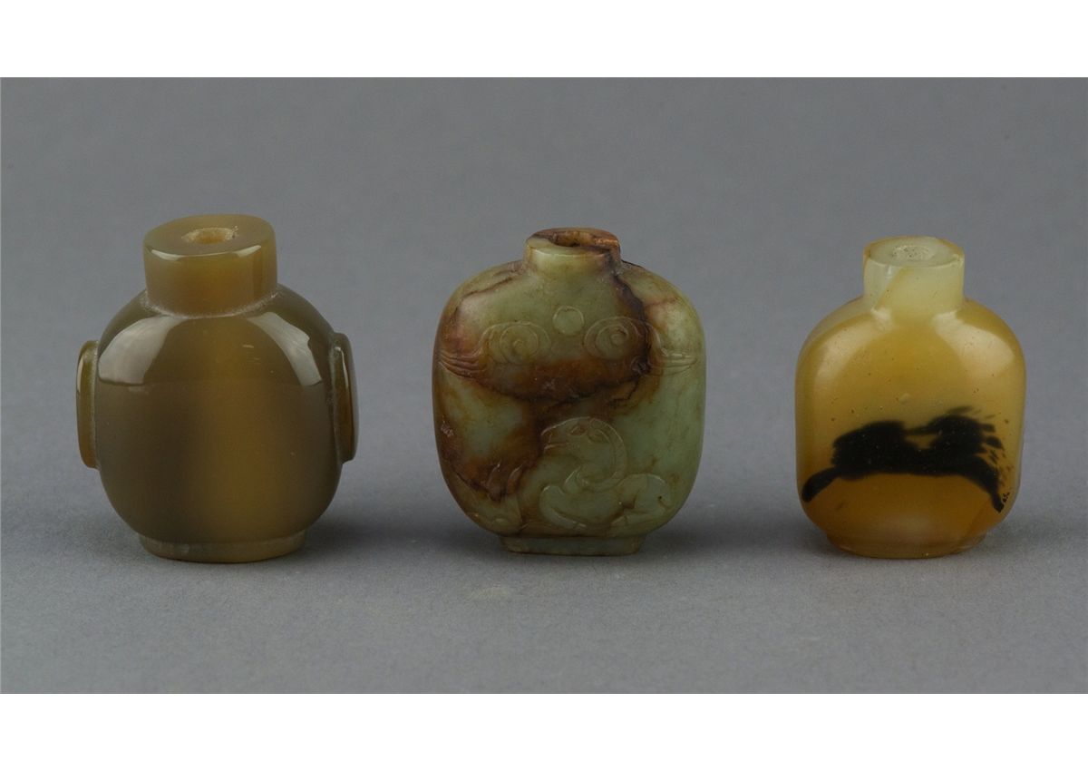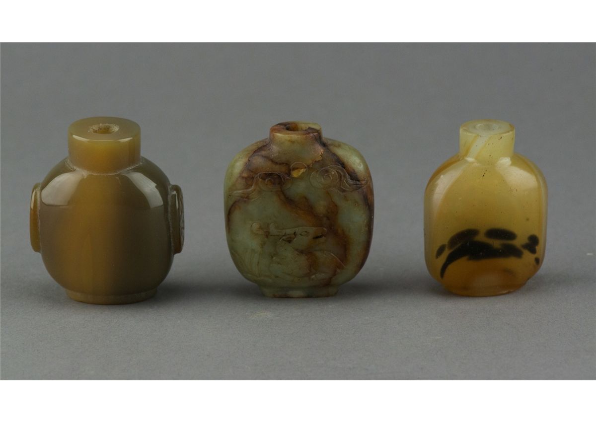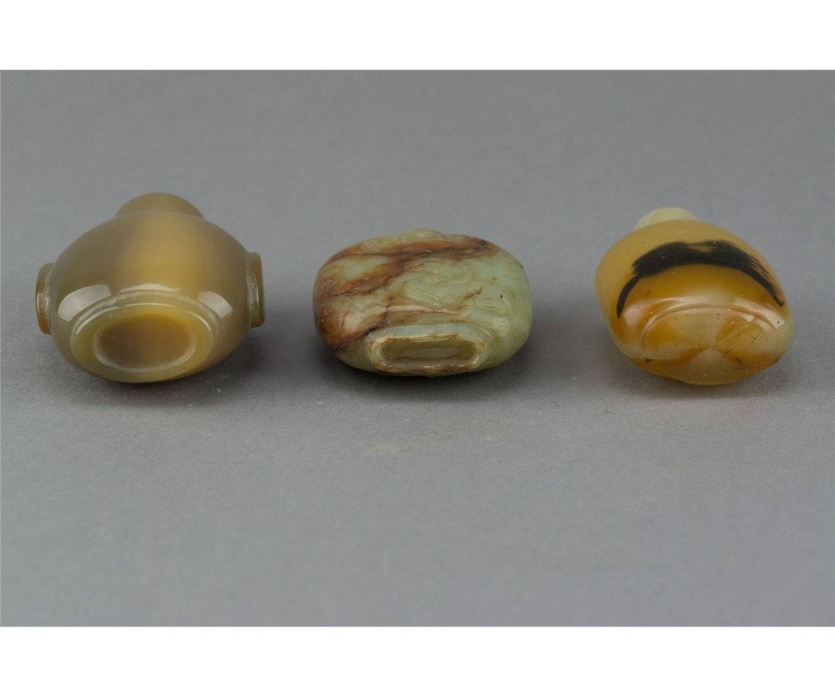 Group of three Chinese agate and jade snuff bottles; H: 5 cm, W: 3.5 cm, total 150 grams; Provenance: Ma Collection Toronto