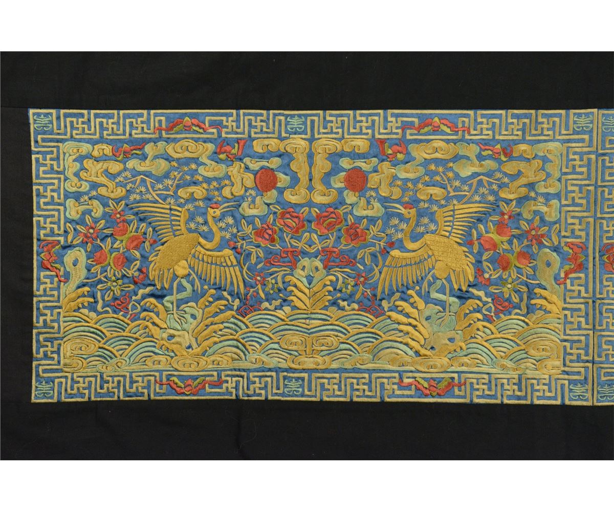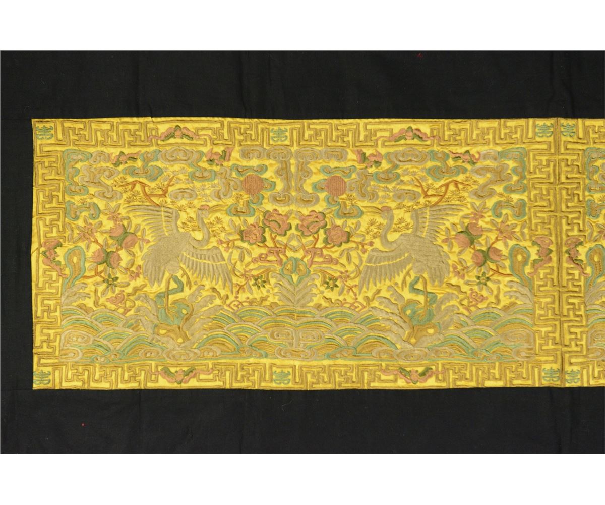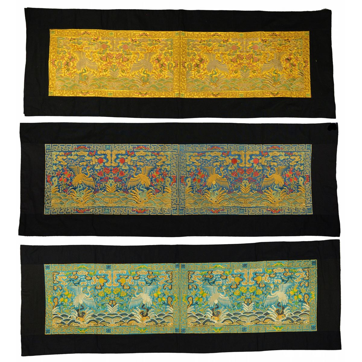 Three pieces of Chinese hand embroidery, meticulously stitched with golden thread on silk, richly decorated with auspicious cranes and foliage above patterned sea wave within stylized yun scroll. 26 cm x 95 cm each.