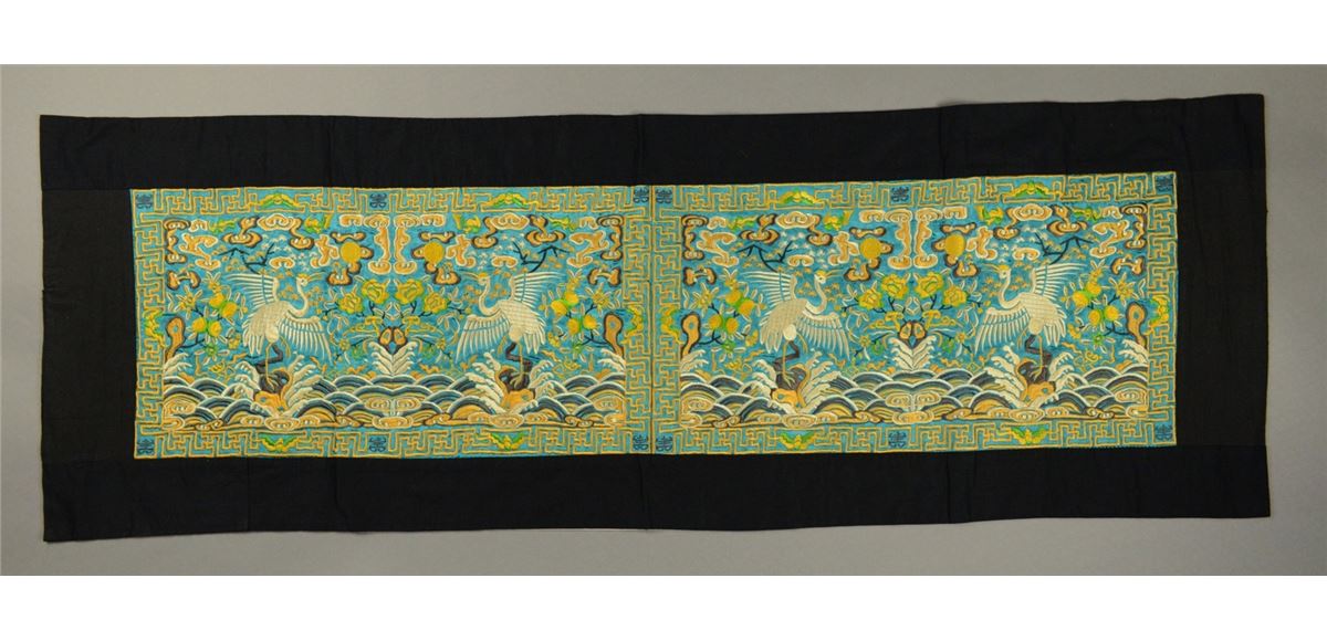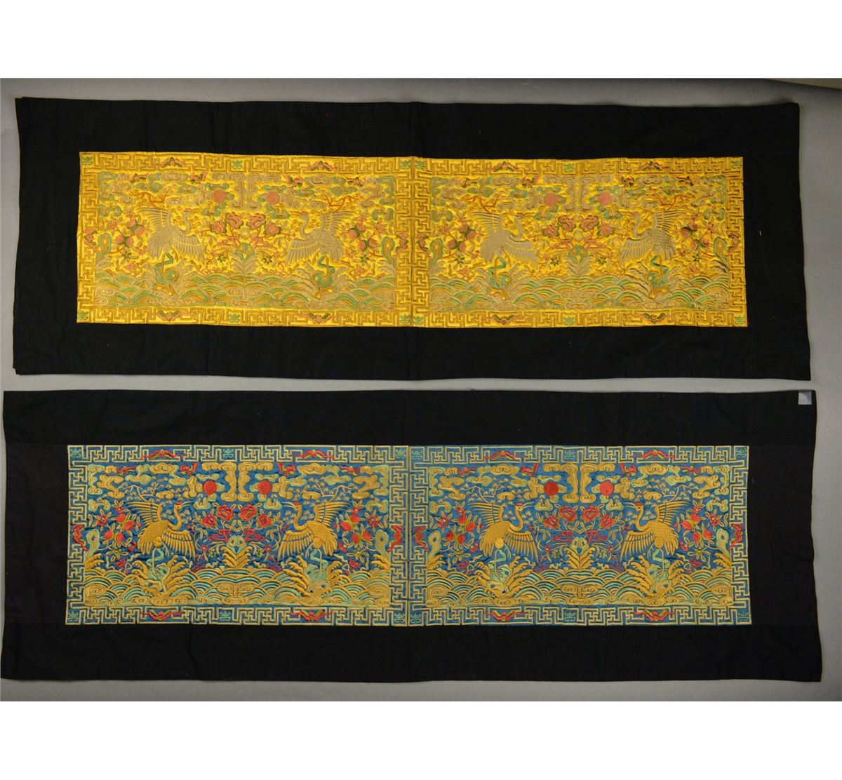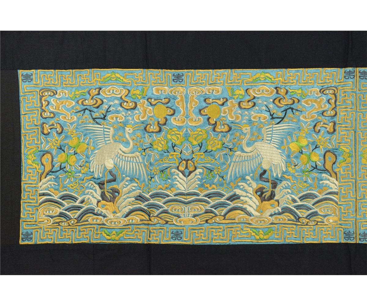 Three pieces of Chinese hand embroidery, meticulously stitched with golden thread on silk, richly decorated with auspicious cranes and foliage above patterned sea wave within stylized yun scroll. 26 cm x 95 cm each.
