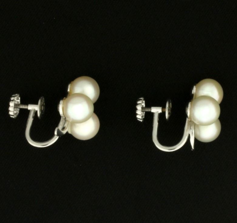 In 14k white gold. Each earring has three high quality 6.5mm pearls with great bright color and luster. 3/4" long, with screw backs. 4.3g.