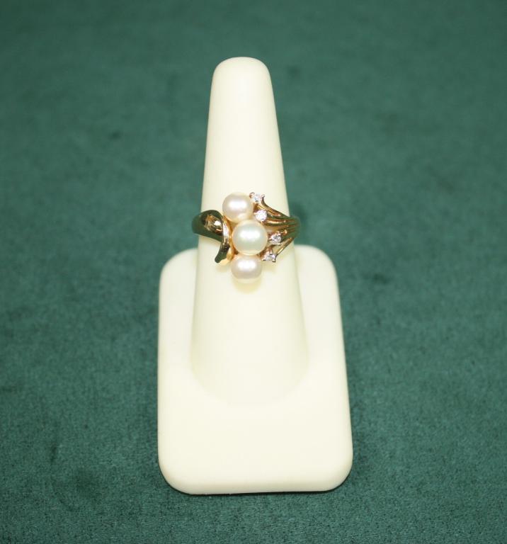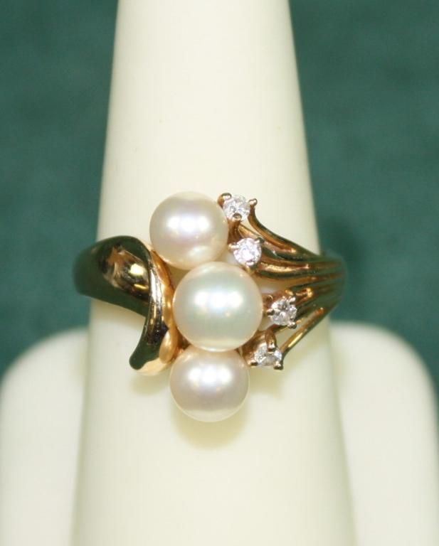 3-Pearl and Diamond Ring set in 14kt yellow gold. Est. $100-$200