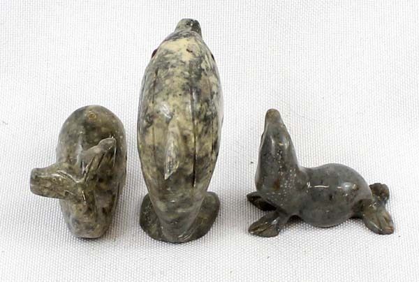 3 Peruvian Carved Stone Animals, largest measures 2'' x 2'', features dolphin, seal, and whale