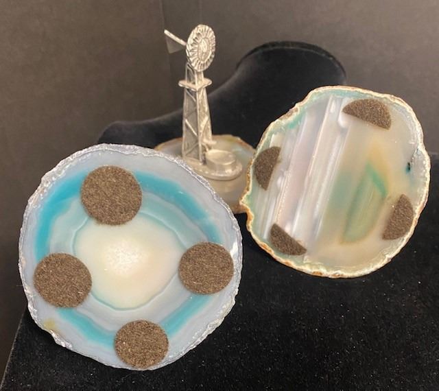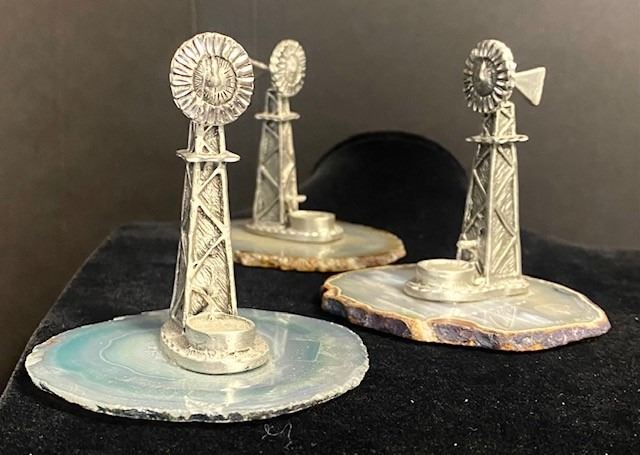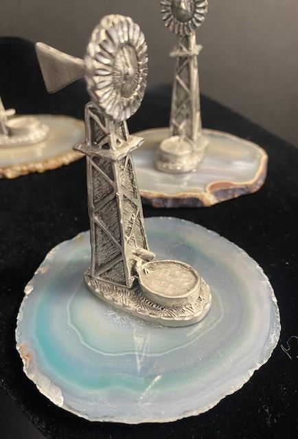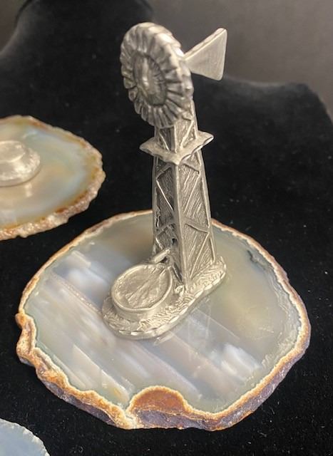 These came out of a Greensburg, Kansas Estate. The fellow spent his winter in Greensburg in his Shop making the coolest Unique Highly Designed Pewter and mounting on Sliced Agate Geode. Then he spent the Summer in Red River, New Mexico selling them.