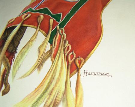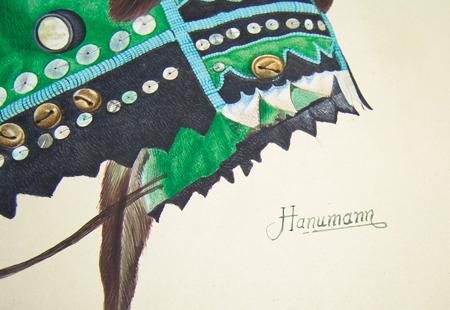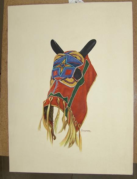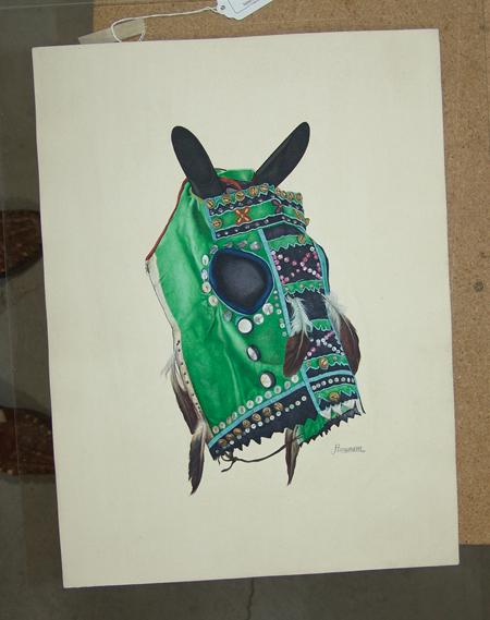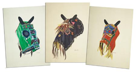 Circa Early 2000, Exquisite signed original watercolors on paper done in great detail and showing three magnificent beaded horse masks. Excellent condition, unframed. 18" x 13" each